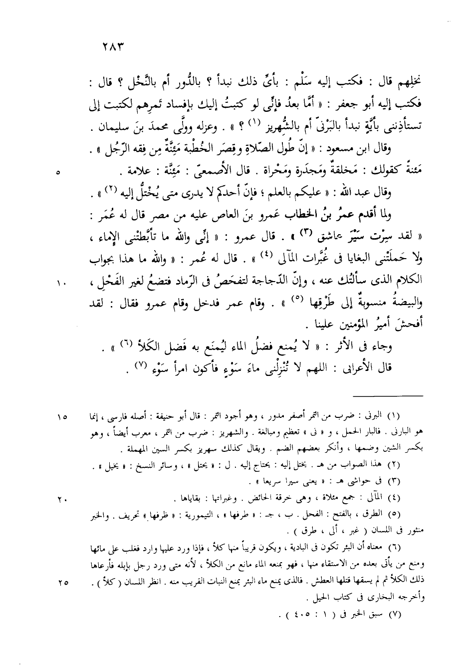 نخلهم قال فكتب اليه سلم بأي ذلك نبدأ بالدور ام بالنخل فكتب اليه أبو جعفر أما بعد فاني لو كتبت إليك بإفساد ثمرهم لكتبت الي تستأذنني بأيه نبدأ بالبرني ام بالشهريز وعزله وولى محمد بن سليمان
