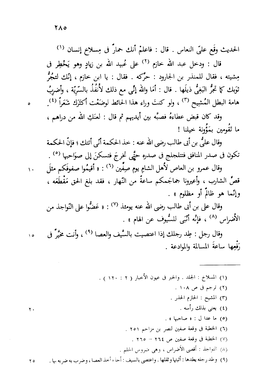 وقال عمرو بن العاص لأهل الشام يوم صفين أقيموا صفوفكم مثل قص الشارب وأعيرونا جماجمكم ساعة من النهار فقد بلغ الحق مقطعه فوانما هو ظالم او مظلوم