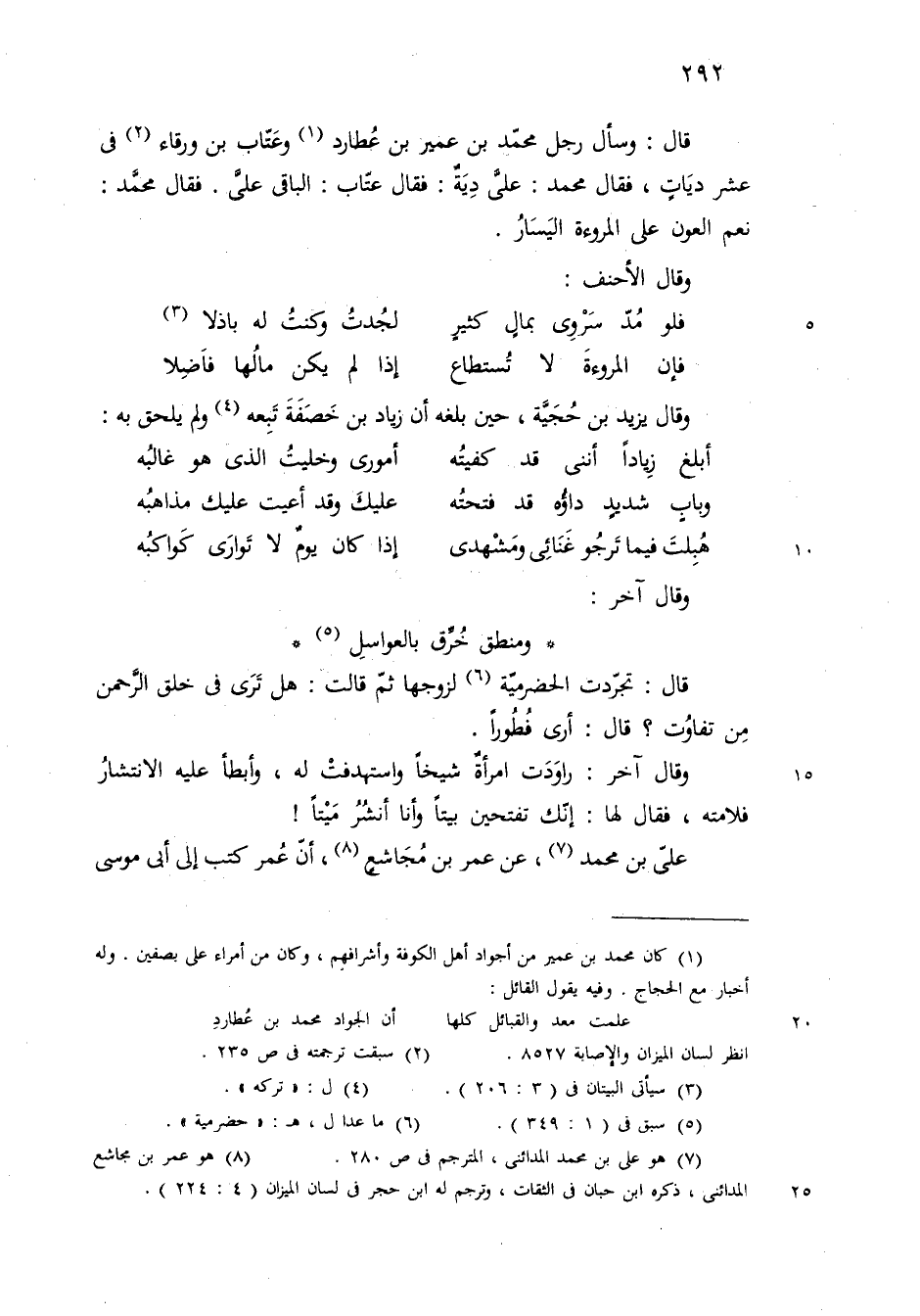 وسأل رجل محمد بن عمير بن عطارد وعتاب بن ورقاء في عشر ديات فقال محمد علي دية فقال عتاب الباقي علي فقال محمد نعم العون اليسار على المروءة