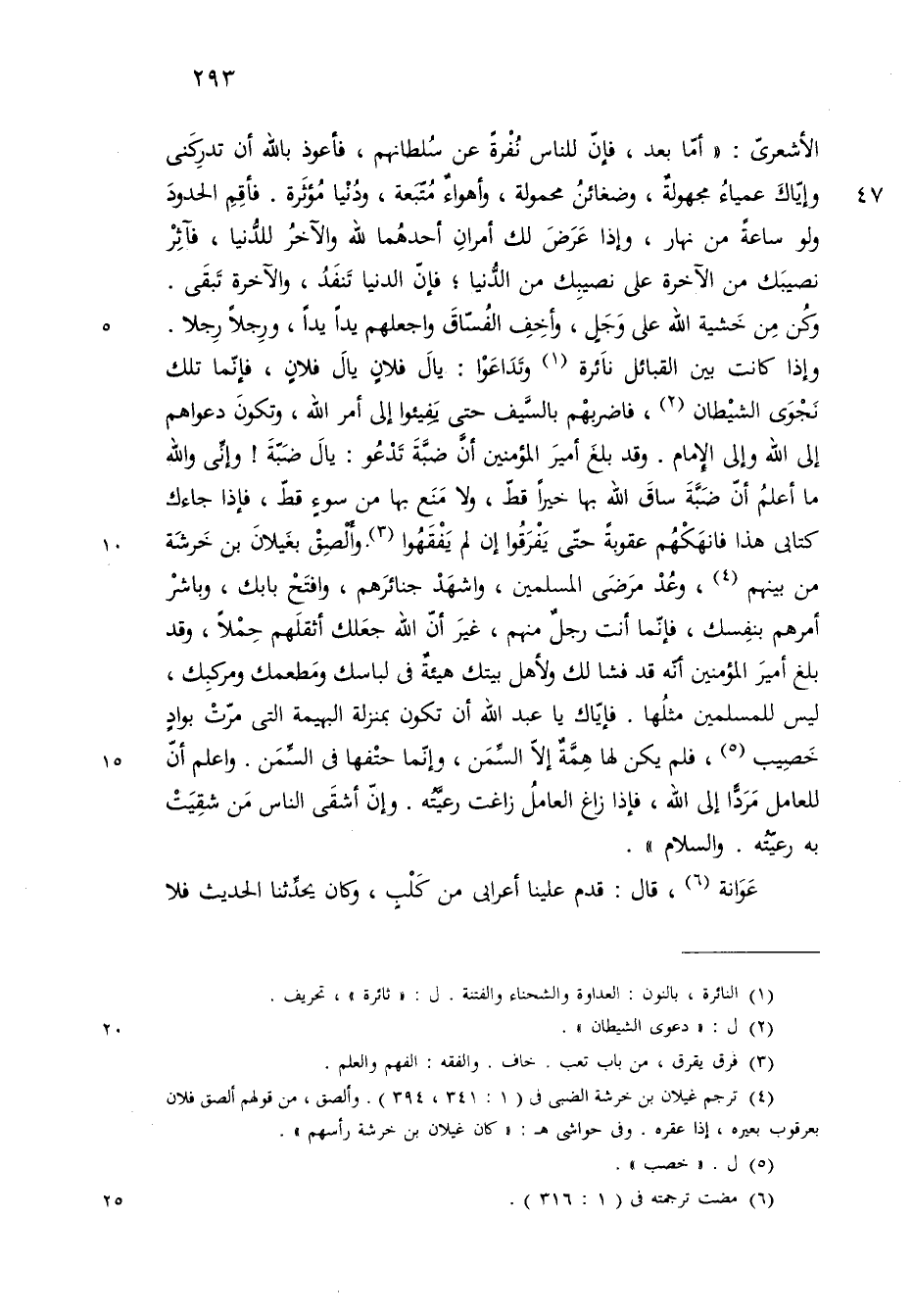 أما بعد فأن للناس نفرة عن سلطانهم فأعوذ بالله ان تدركني وإياك عمياء مجهولة وضغائن محمولة واهواء متبعة ودنيا مؤثرة فأقم الحدود ولو ساعة من نهار واذا عرض لك أمران احدهما لله والآخر للدنيا فآثر نصيبك من الاخرة على نصيبك من الدنيا فان الدنيا تنفد والاخرة تبقى وكن من خشية الله على وجل وأخف الفساق واجعلهم يدا يدا ورجلا رجلا واذا كانت بين القبائل نائرة وتداعوا يا ال فلان فانما تملك نجوى الشيطان فاضربهم بالسيف حتى يفيئوا الى أمر الله وتكون دعواهم الى الله والى الامام وقد بلغ أمير المؤمنين ان ضبة تدعو يا آل ضبة وإني والله ما أعلم ان ضبة ساق الله بها خيرا قط ولا منع بها سوءا قط فاذا جاءك كتابي هذا فأنهكهم