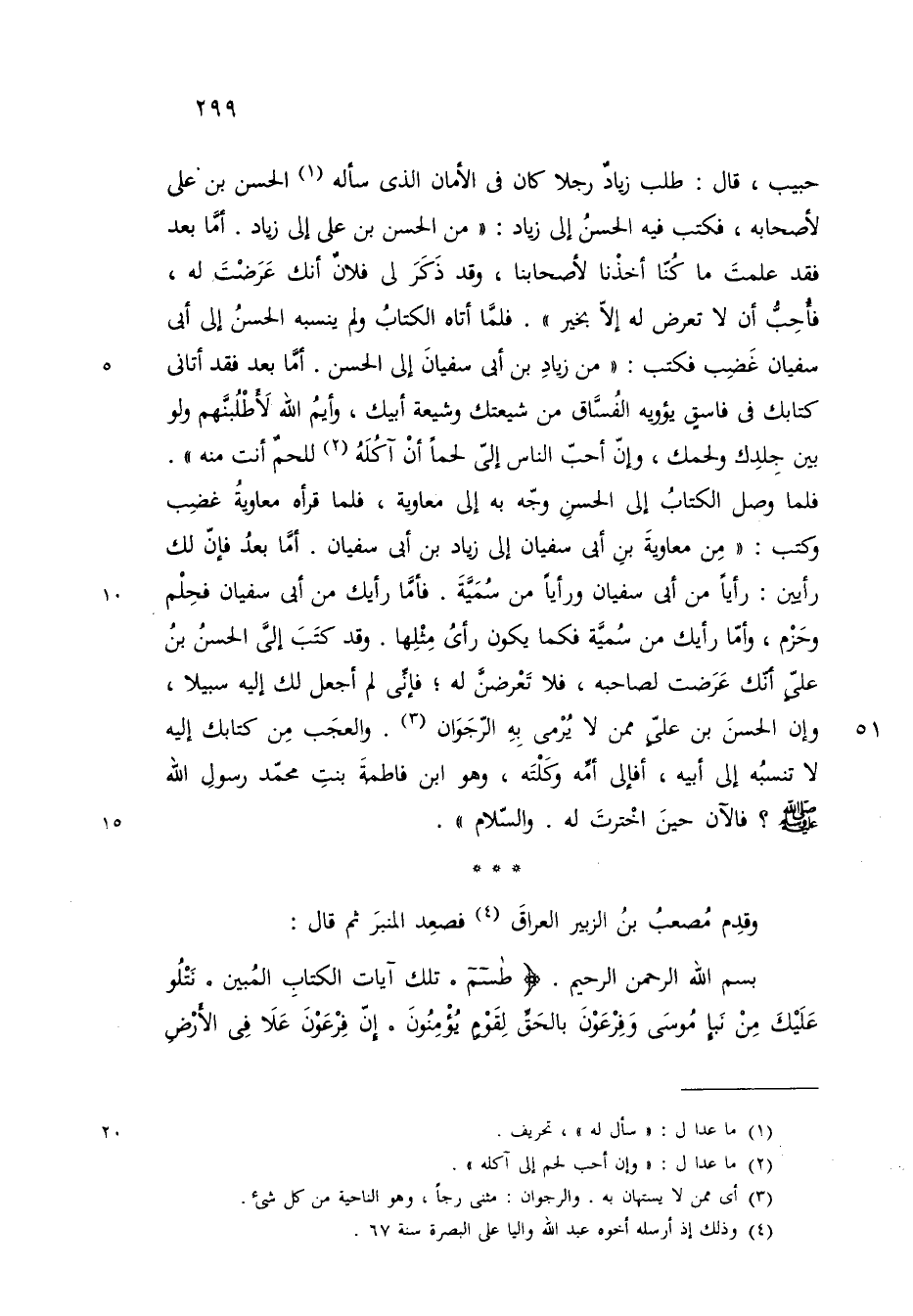 من زياد بن ابي سفيان الى الحسن اما بعد أتاني كتابك في فاسق يؤويه الفساق من شيعتك وشيعة أبيك وأيم الله لأطلبنهم ولو بين جلدك ولحمك وان أحب لحم إلي آكله للحم انت منه