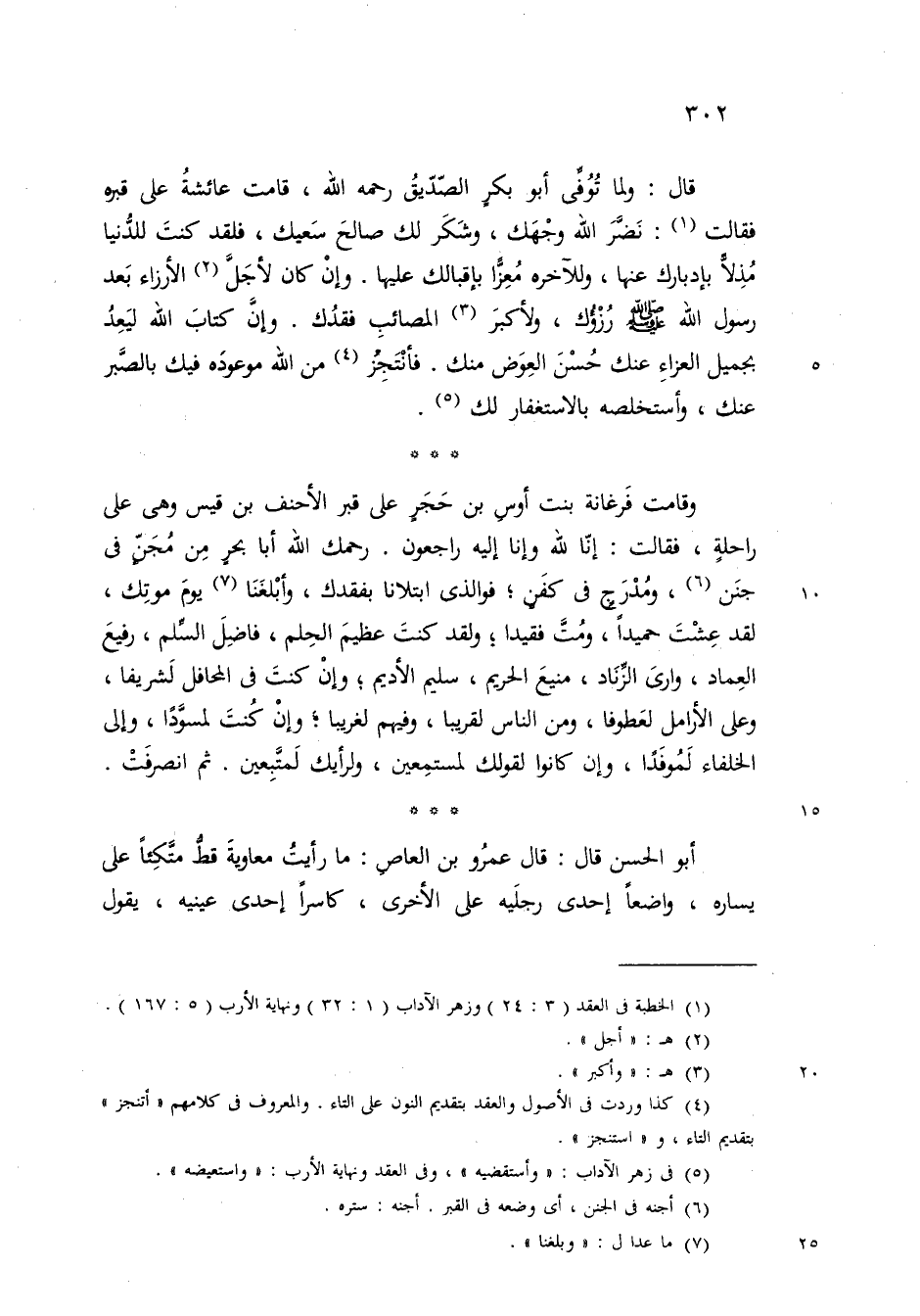 وقامت فرغانة بنت أوس بن حجر على قبر الأحنف بن قيس وهي على راحلة فقالت إنا لله وإنا اليه راجعون رحمك الله أبا بحر من مجن في جنن ومدرج في كفن فوالذي ابتلاني بفقدك وبلغنا يوم موتك لقد عشت حميدا ومت فقيدا ولقد كنت عظيم الحلم فاضل السلم رفيع العماد واري الزناد منيع الحريم سليم الاديم وان كنت في المحافل لشريفا وعلى الارامل لعطوفا ومن الناس لقريبا وفيهم لغريبا وان كنت لمسودا والى الخلفاء لموفدا وان كانوا لقولك لمستمعين ولرأيك لمتبعين ثم انصرفت