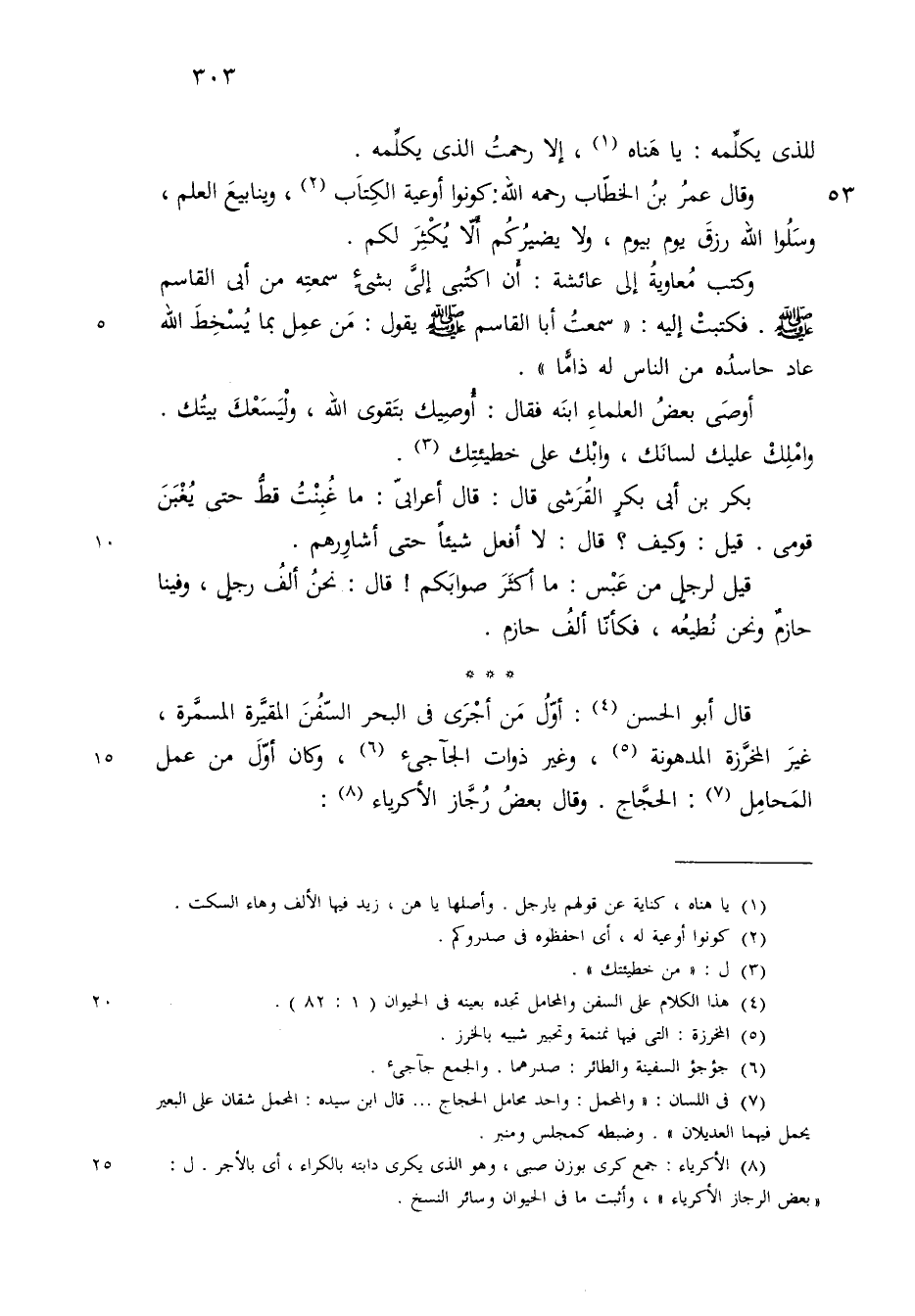 قال ابو الحسن أول من اجرى في البحر السفن المقيرة المسمرة غير المخرزة والمدهونة وغير ذوات الجآجىء وكان أول من عمل المحامل الحجاج قال بعض رجاز الاكرياء@