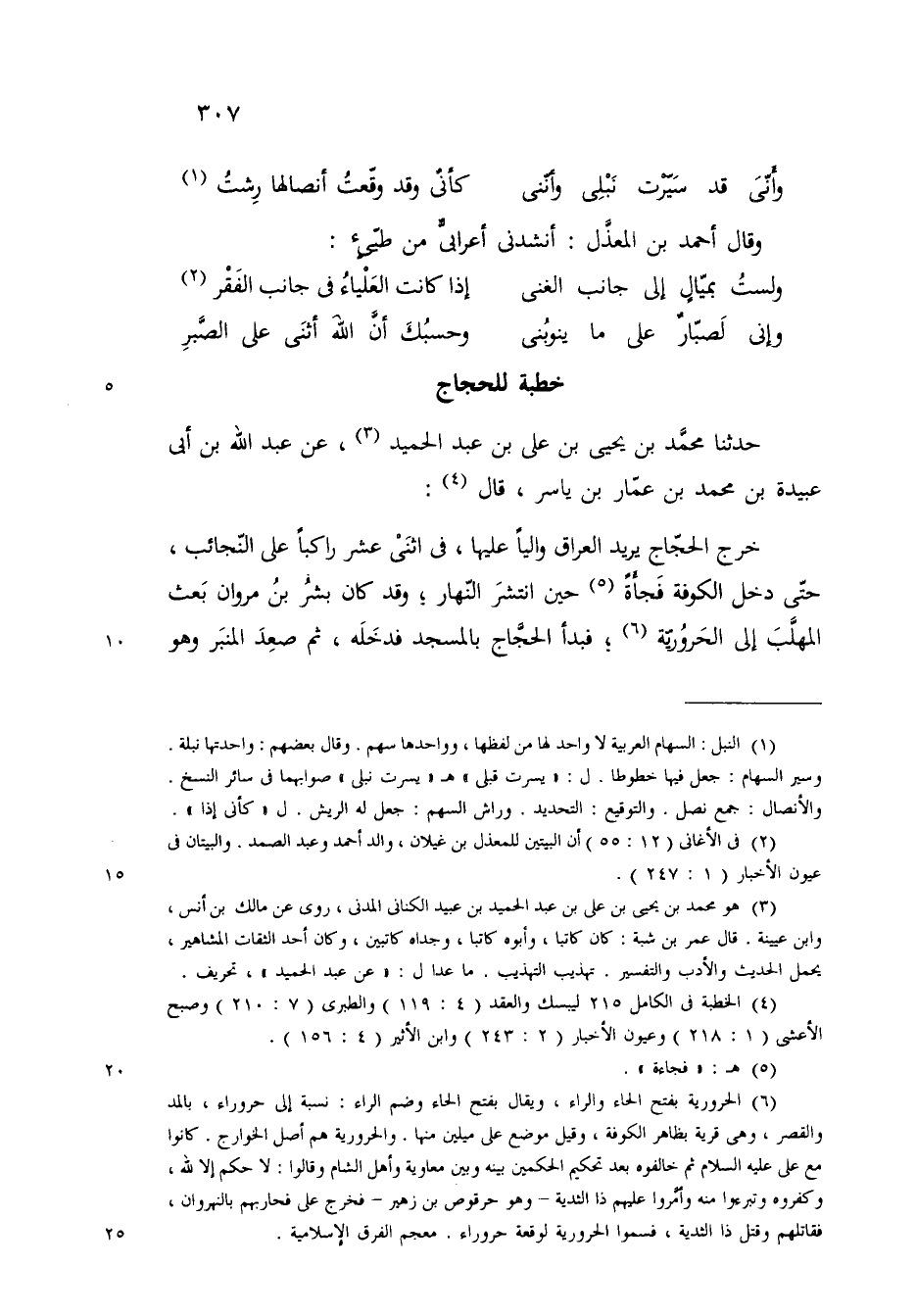 حدثني محمد بن يحيى بن علي عن عبد الحميد عن عبد الله بن ابي عبيدة ابن محمد بن عمار بن ياسر قال خرج الحجاج يريد العراق واليا عليها في اثنى عشر راكبا علىالنجائب حتى دخل الكوفة فجأة حين انتشر النهار - وقد كان بشر بن مروان بعث المهلب الى الحرورية - فبدأ الحجاج بالمسجد فدخله ثم صعد المنبر وهو@