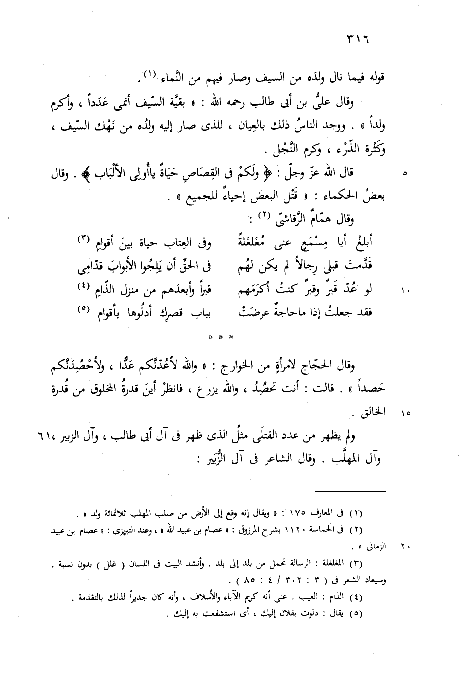 وقال علي بن أبي طالب كرم الله تعالى وجهه بقية السيف أنمى عددا واكثر ولدا ووجد الناس ذلك بالعيان للذي صار اليه ولده من نهك السيف وكثرة الذرء وكرم النجل