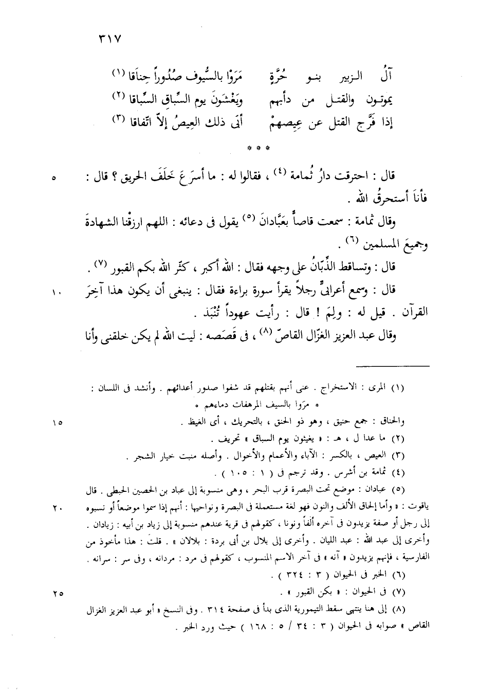 احترقت دار ثمامة فقالوا له ما اسرع خلف الحريق قال فأنا استحرق الله وقال ثمامة سمعت قاصا بعبادان يقول في دعائه اللهم ارزقنا الشهادة وجميع المسلمين قال وتساقط الذبان على وجهه فقال الله اكبر كثر الله بكم القبور قال وسمع اعرابي رجلا يقرأ سورة براءة فقال ينبغي ان يكون هذا اخر القران قيل له ولم قال رأيت عهودا تنبذ وقال ابو عبد العزيز قال الغزال القاص في قصصه ليت الله لم يكن خلقني وأنا@