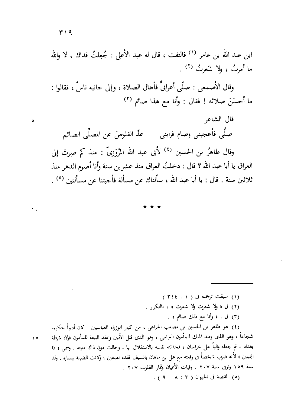وقال طاهر بن الحسين لأبي عبد الله المروزي منذكم صرت الىالعراق يا أبا عبدالله قال دخلت العراق منذ عشرين سنة وانا أصوم الدهر منذ ثلاثين سنة قال يا أبا عبدالله سألناك عن مسألة فأجبتنا عن مسألتين@