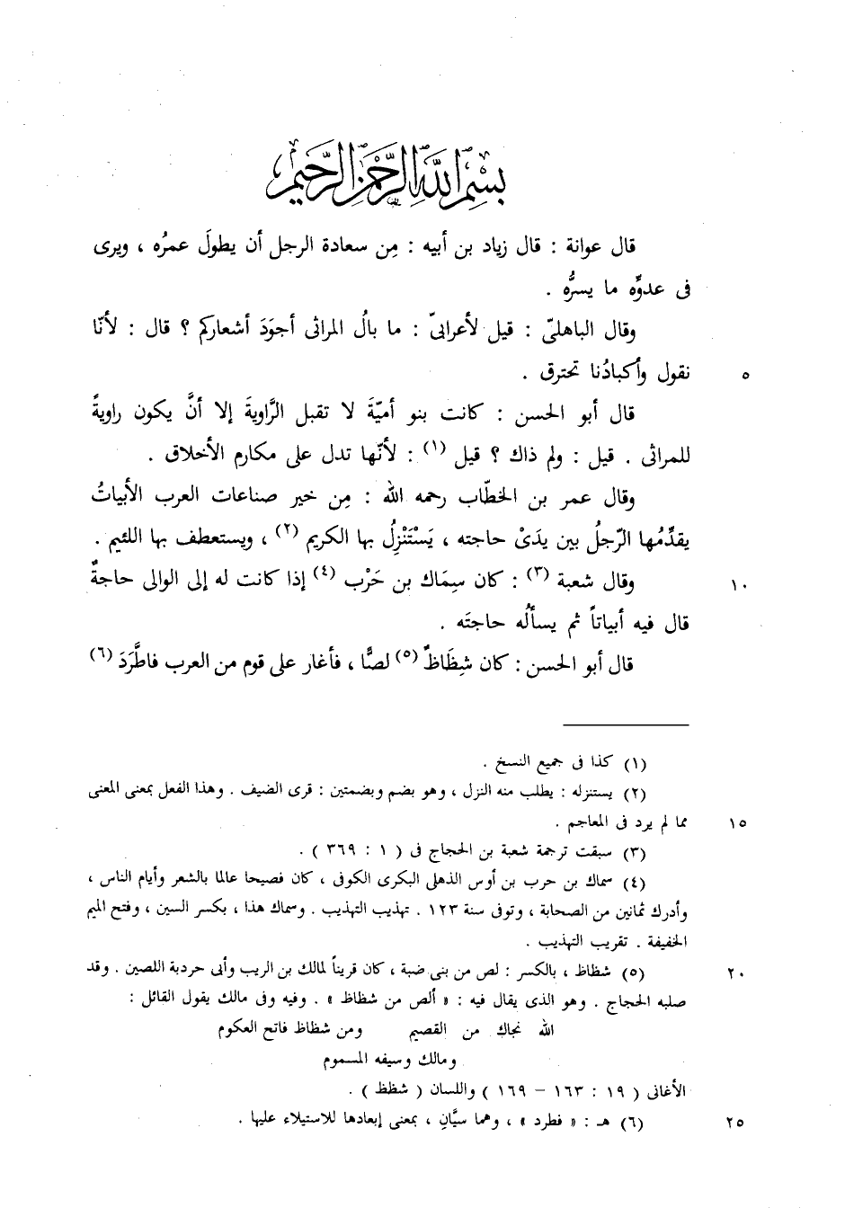 قال عوانة قال زياد بن أبيه من سعادة الرجل ان يطول عمره ويرى في عدوه مايسره قال الباهلي قيل لأعرابي مابال المراثي أجود أشعاركم