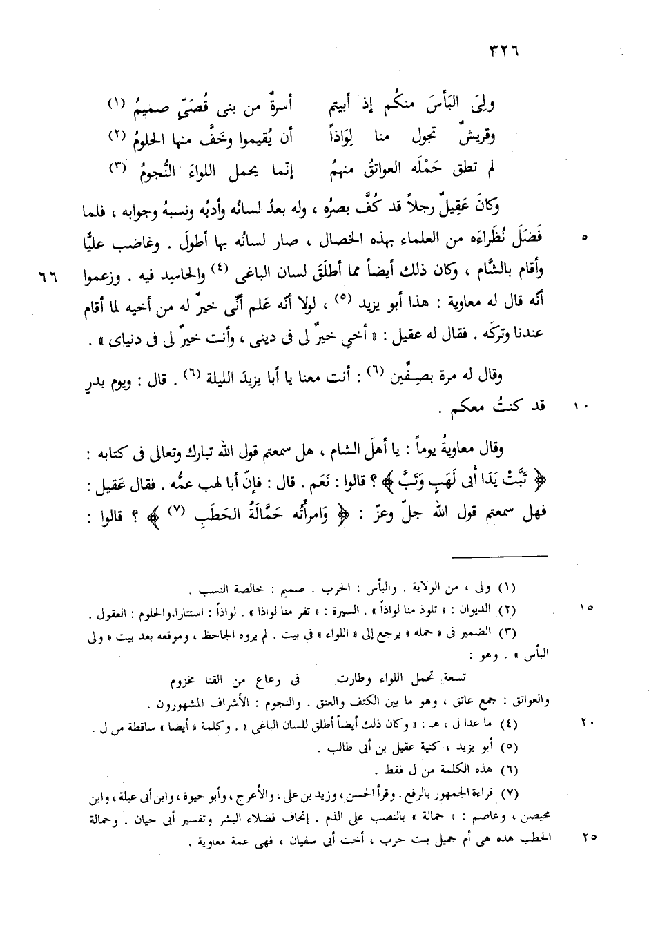وقال معاوية يوما يا اهل الشام هل سمعتم قول الله تبارك وتعالى في كتابه ( تبت يدا ابي لهب وتب ) قالوا نعم قال فان أبا لهب عمه فقال عقيل فهل سمعتم قول الله عز و جل ( وامرأته حمالة الحطب ) قالوا@