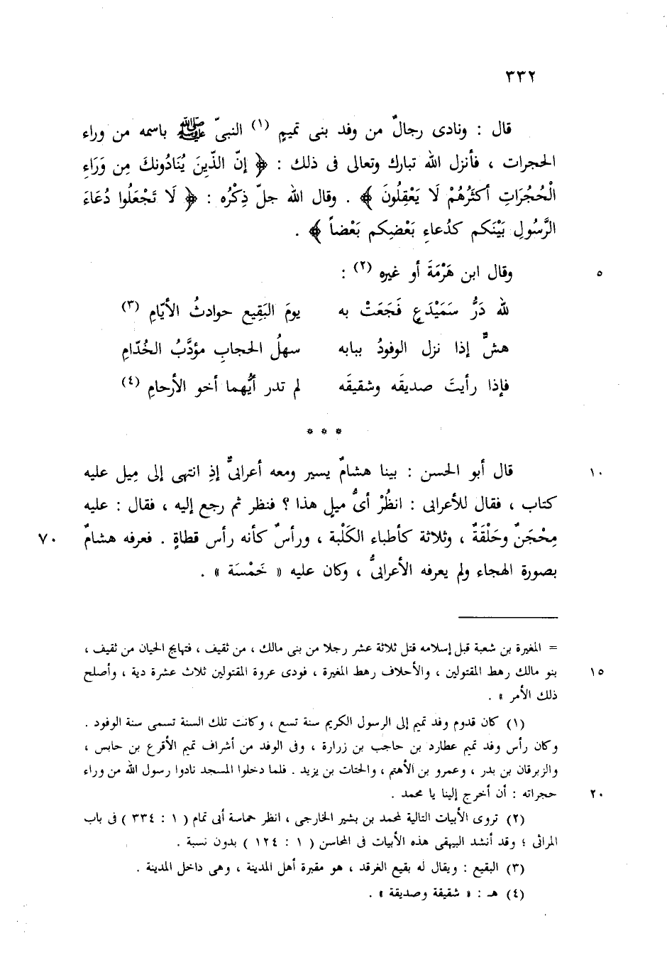 ونادى رجال من وفد بني تميم النبي باسمه من وراء الحجرات فقال الله تعالى ( ان الذين ينادونك من وراء الحجرات اكثرهم لا يعقلون ) وقال الله عز و جل ذكره ( لا تجعلوا دعاء الرسول بينكم كدعاء بعضكم بعضا ) وقال ابن هرمة او غيره
