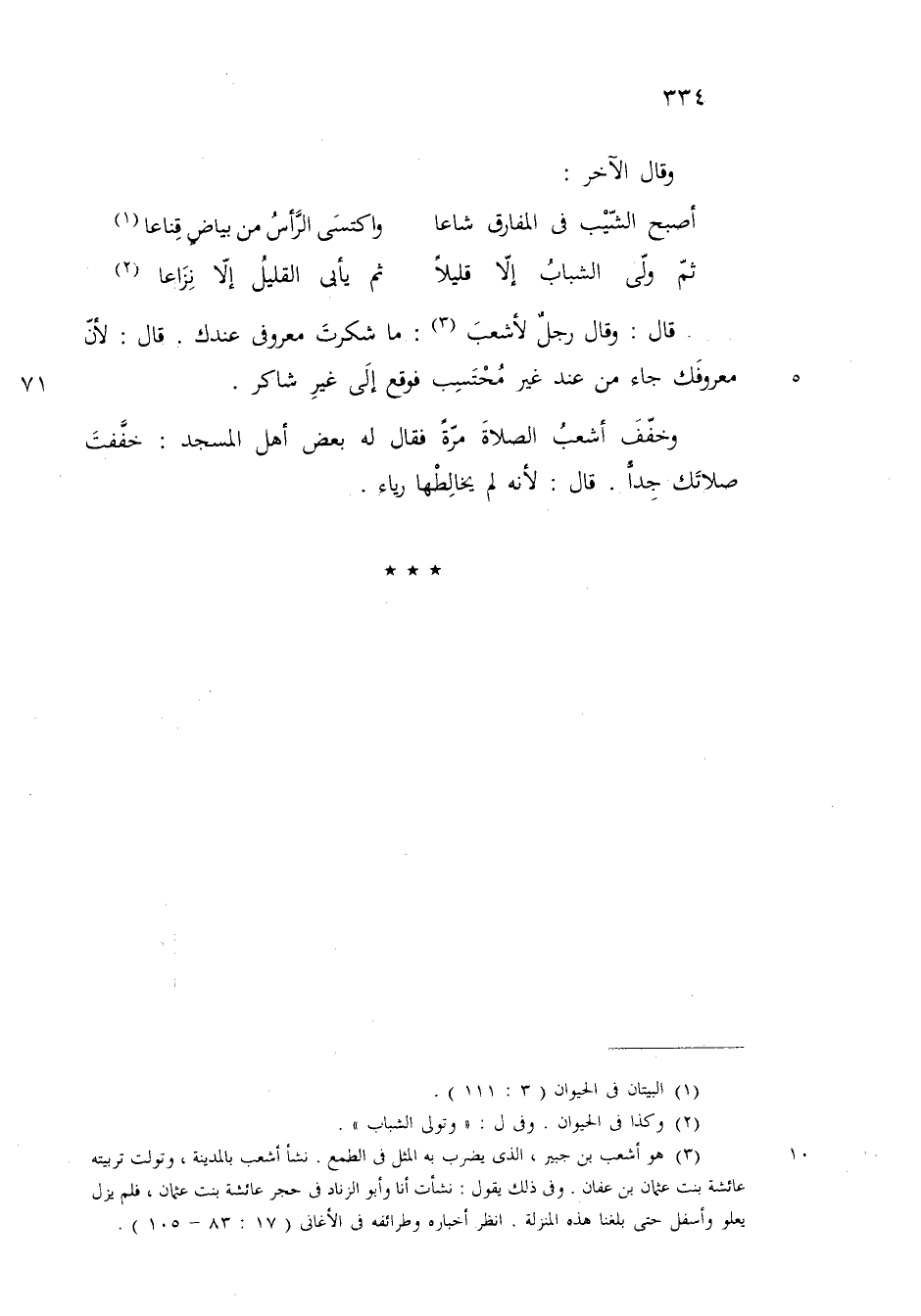 وقال رجل لأشعب ما شكرت معروفي عندك قال لان معروفك جاء من عند غير محتسب فوقع الىغير شاكر وخفف أشعب الصلاة مرة فقال له بعض أهل المسجد خففت صلاتك جدا فقال لانه لم يخالطها رياء@