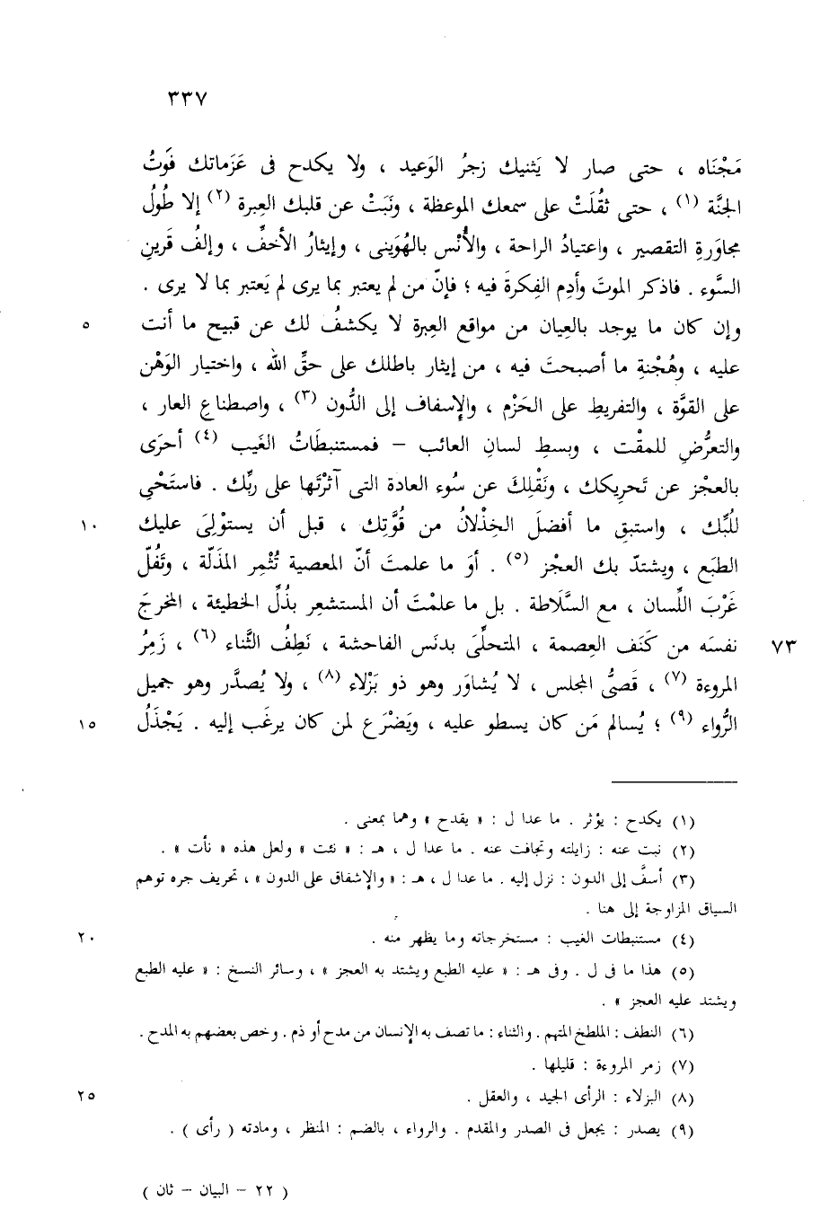 والتفريط على الحزم والاشفاق علىالدون واصطناع العار والتعرض للمقت وبسط لسان العائب فمستنبطات الغيب احرى بالعجز عن تحريكك ونقلك عن سوء العادة التي اثرتها على ربك فاسحي للبك واستبق ما أفضل الخذلان من قوتك قبل ان يستولي عليه الطبع ويشتد عليه العجز او ما علمت ان المعصية تثمر المذلة وتفل غرب اللسان مع السلاطة بل ما علمت ان المستشعر بذل الخطيئة المخرج نفسه من كنف العصمة المتحلي بدنس الفاحشة قطف الثناء زمر المروءة قصي المجلس لا يشاور وهو ذو بذلاء ولا يصدر وهو جميل الرواء يسالم من كان يسطو عليه ويضرع لمن كان يرغب اليه يجذل@