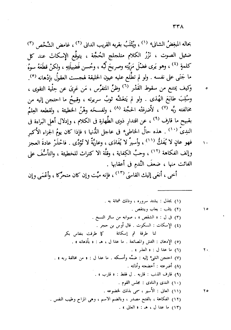 بحاله المبغض الشاني ويثلب بقربه القريب الداني غامض الشخص ضئيل الصوت نزر الكلام متلجلج الحجة يتوقع الاسكات عند كل كلمة وهو يرى فضل مزيته وصريح لبه وحسن فضيلته ولكن قطعه سوء ما جنى علىنفسه ولولم تطلع عليه عيون الخليقة لهجت العقول بادهانه وكيف يمتنع من سقوط القدر وظن المتفرس من عري من حلية التقوى وسلب طائع الهدى ولو لم يتغشه ثوب سريرته وقبيح ما احتجن اليه من مخالفة ربه لأضرعته الحجة ولفسخه وهن الخطيئة ولقطعه العلم بقبيح ما قارف عن اقتدار ذوي الطهارة في الكلام وإدلال أهل البراءة في النداء وهذه حال الخاطىء في عاجل الدنيا فإذا كان يوم الجزاء الاكبر فهو عان لا يفك وأسير لا يفادى وعارية لا تؤدى فاحذر عادة العجز وإلف الفكاهة وحب الكفاية وقلة الاكتراث للخطيئة والتأسف على الفائت منها وضعف الندم في أعقابها