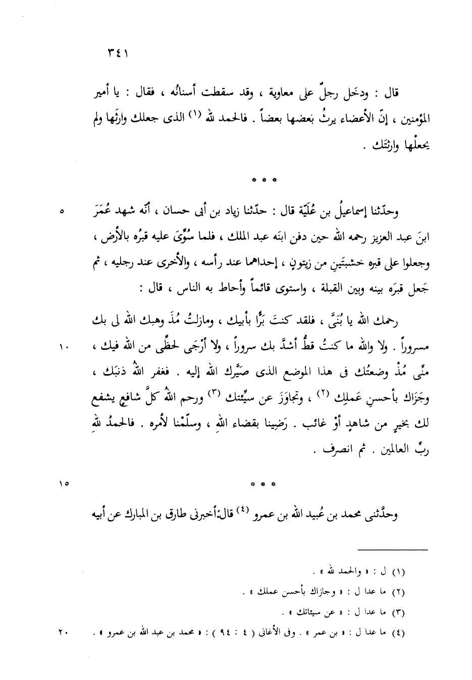 وحدثنا اسماعيل بن علية قال حدثنا زياد بن حسان أنه شهد عمر بن عبد العزيز حين دفن ابنه عبد الملك فلما سوى عليه قبره بالارض وجعلوا على قبره خشبتين من زيتون احداهما عند رأسه والاخرى عند رجليه ثم جعل قبره بينه وبين القبلة واستوى قائما واحاط به الناس قال رحمك الله يا بني فقد كنت برا بأبيك ومازلت مذ وهبك الله لي بك مسرورا ولا والله ماكنت قط مسرورا بك ولا أرجي لحظي من الله فيك منذ وضعتك في الموضع الذي صيرك الله اليه فغفر الله لك ذنبك وجازاك بأحسن عملك وتجاوز عن سيئاتك ورحم الله كل شافع يشفع لك بخير من شاهد وغائب رضينا بقضاء الله وسلمنا لأمره فالحمد لله رب العالمين