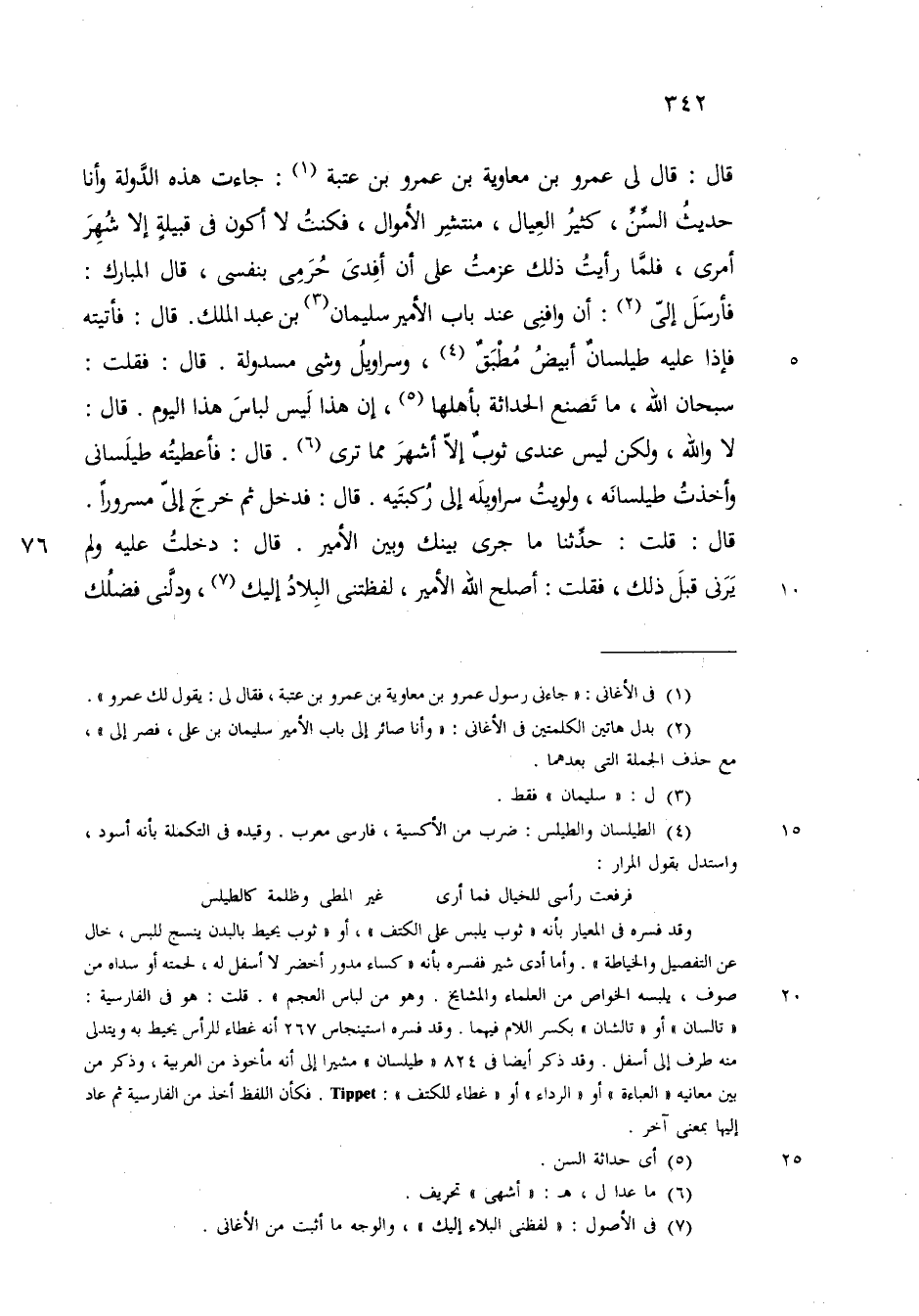 قال قال لي عمرو بن معاوية بن عتبة جاءت هذه الدولة وأنا حديث السن كثير العيال منتشر الأموال فكنت لا اكون في قبيلة إلا شهر أمري فلما رأيت ذلك عزمت على ان أفدي حرمي بنفسي قال المبارك فأرسل إلي ان وافني عند باب الامير سليمان بن عبد الملك قال فأتيته فاذا عليه طيلسان أبيض مطبق وسراويل وشي مسدولة قال فقلت يا سبحان الله ما تصنع الحداثة بأهلها ان هذا لبس من لباس هذا اليوم قال لا والله لكن ليس عندي ثوب ألا أشهى ما ترى قال فأعطيته طيلساني واخذت طيلسانه ولويت سراويله الى ركبتيه قال فدخل ثم خرج إلي مسرورا قال فقلت له حدثنا ما جرى بينك وبين الامير قال دخلت عليه - ولم يرني قبل ذلك - فقلت أصلح الله الامير لفظني البلاء اليك ودلني فضلك@