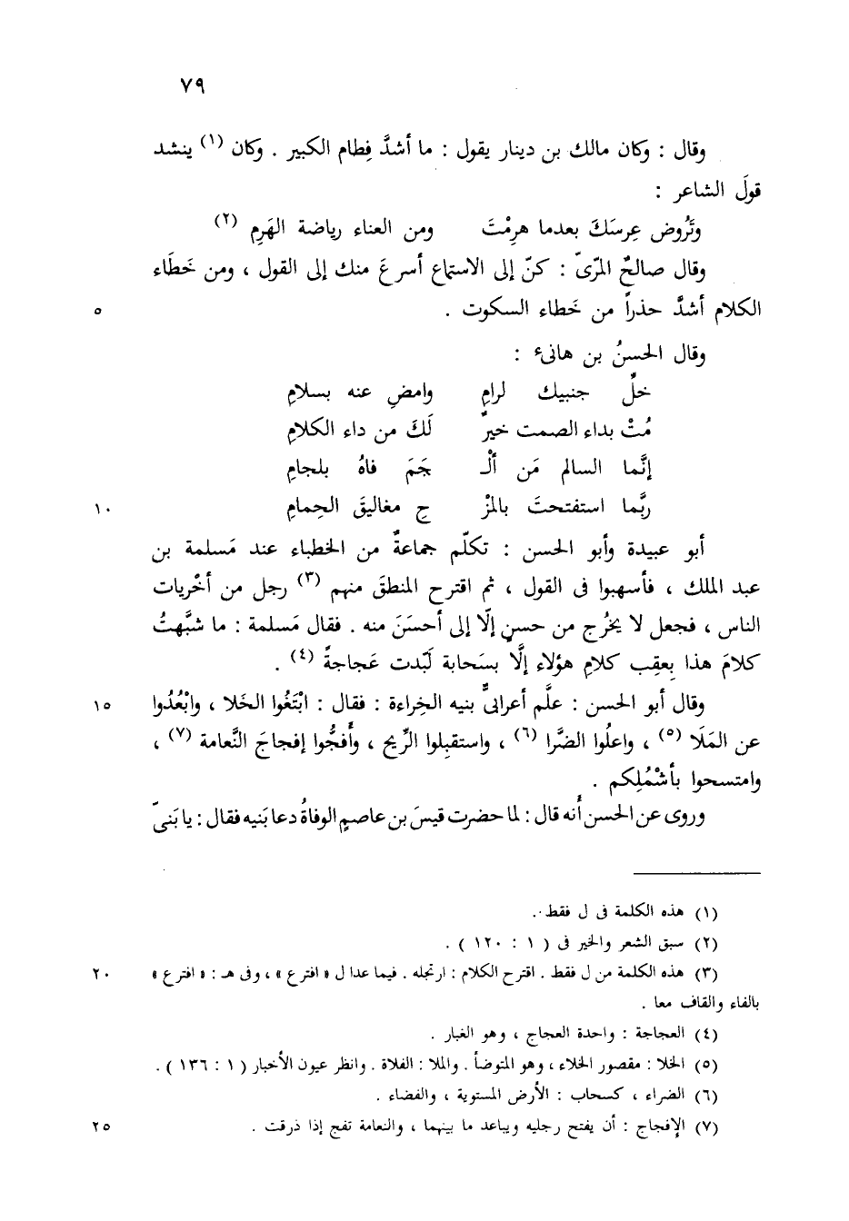 قال أبو عبيدة وأبو الحسن تلكم جماعة من الخطباء عند مسلمة بن عبد الملك فأسهبوا في القول ثم اقترع المنطق رجل من أخريات الناس لا يخرج من حسن الا الى احسن منه فقال مسلمة ما شبهت كلام هذا بعقب كلام هؤلاء الا بسحابة لبدت عجاجة