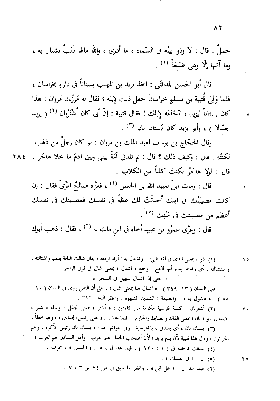 قال ابو الحسن المدائني اتخذ يزيد بن المهلب بستانا بخراسان في داره فلما ولي قتيبة خراسان جعل ذلك لابله فقال له مرزبان مروان هذاكان بستانا ليزيد وقد اتخذته لا بلك فقال قتيبة ان أبي كان اشتربان - يعني رئيس الجمالين - وأبو يزيد كان بستان بان
