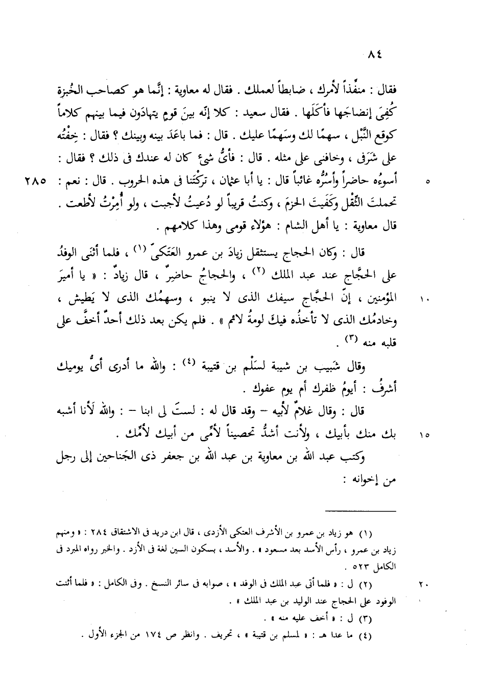الحجاج عند عبد الملك - والحجاج حاضر - قال زياد يا امير المؤمنين ان الحجاج سيفك الذي لا ينبو وسهمك الذي لا يطيش وخادمك الذي لا تأخذه فيك لومة لائم فلم يكن بعد ذلك احد أخف على قلبه منه