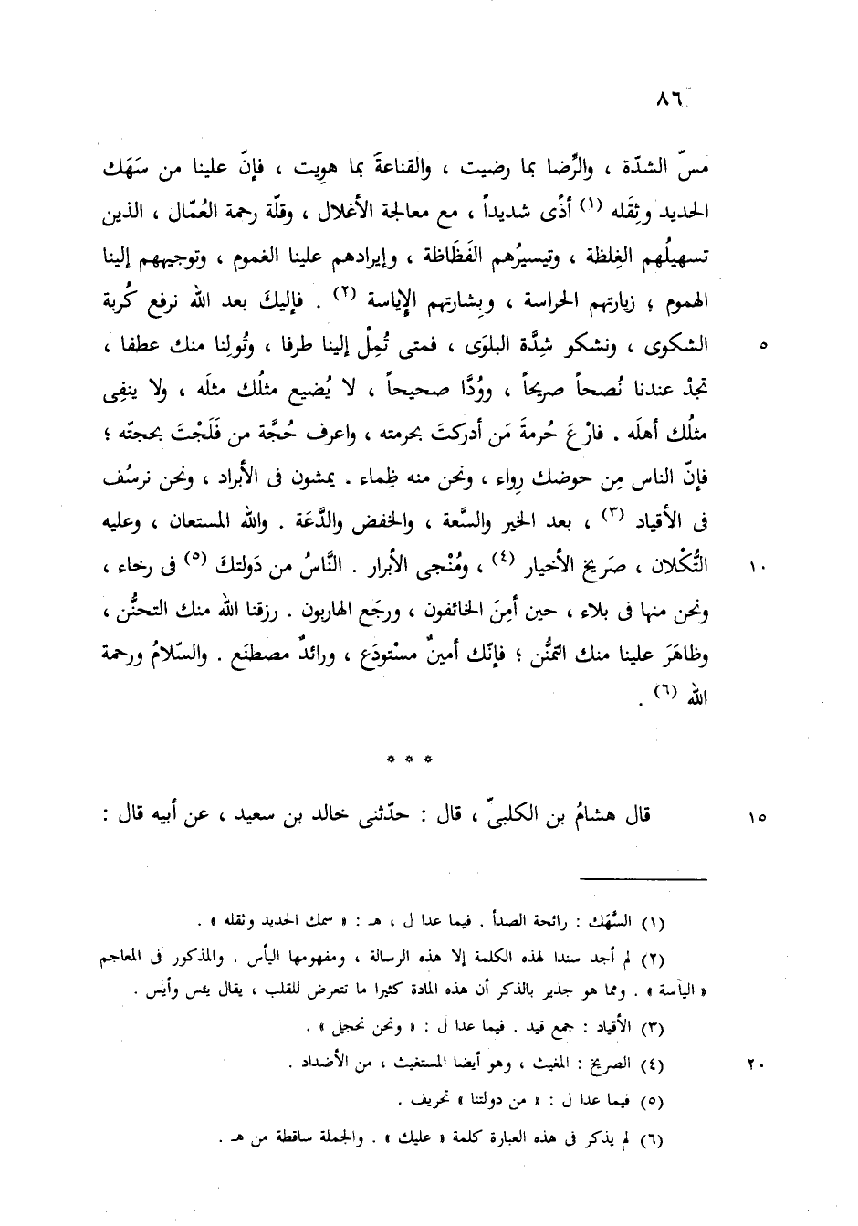 مس الشدة والرضا بما رضيت والقناعة بما هويت فان علينا من سمك الحديد وثقله اذى شديد مع معالجة الاغلال وقلة رحمة العمال الذين تسهيلهم الغلظة وتيسيرهم الفظاظة وإيرادهم علينا الغموم وتوجيههم الينا الهموم زيارتهم الحراسة وبشارتهم الاياسة فاليك بعد الله نرفع كربة الشكوى ونشكو شدة البلوى فمتى تمل الينا طرفا وتولنا منك عطفا تجد عندنا نصحا صريحا وودا