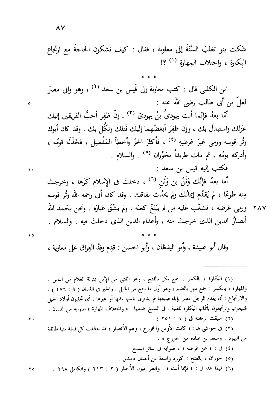 وقال ابن الكلبي كتب معاوية الى قيس بن سعد أما بعد فانك يهودي ابن يهودي ان ظفر أحب الفريقين اليك عزلك واستبدل بك وان ظفر ابغضهما اليك قتلك ونكل بك وكان ابوك وترقوسه ورمى غير غرضه فأكثر الحز واخطأ المفصل فخذله قومه وأدركه يومه ثم مات طريدا بحوران والسلام