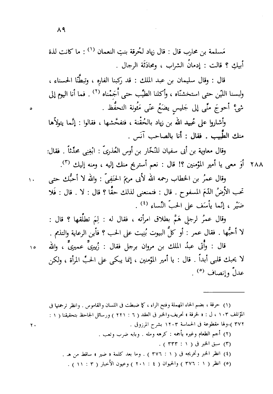 وقال عمر بن الخطاب رضي الله تعالى عنه لابي مريم الحنفي والله لا احبك حتى تحب الارض الدم المسفوح قال فتمنعني لذلك حقا قال لا قال لاضير انما يأسف على الحب النساء وقال عمر لرجل هم بطلاق امراته لم تطلقها قال لا احبها قال او كل البيوت بنيت على الحب فأين الرعاية والتذمم