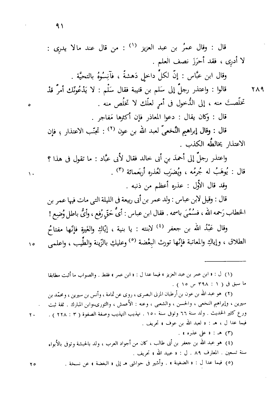 واعتذر رجل الى احمد بن أبي خالد فقال لأبي عياد ما تقول في هذا قال يوهب له جرمه ويضرب على عذره اربعمائة وقد قال الاول عذره اعظم من ذنبه