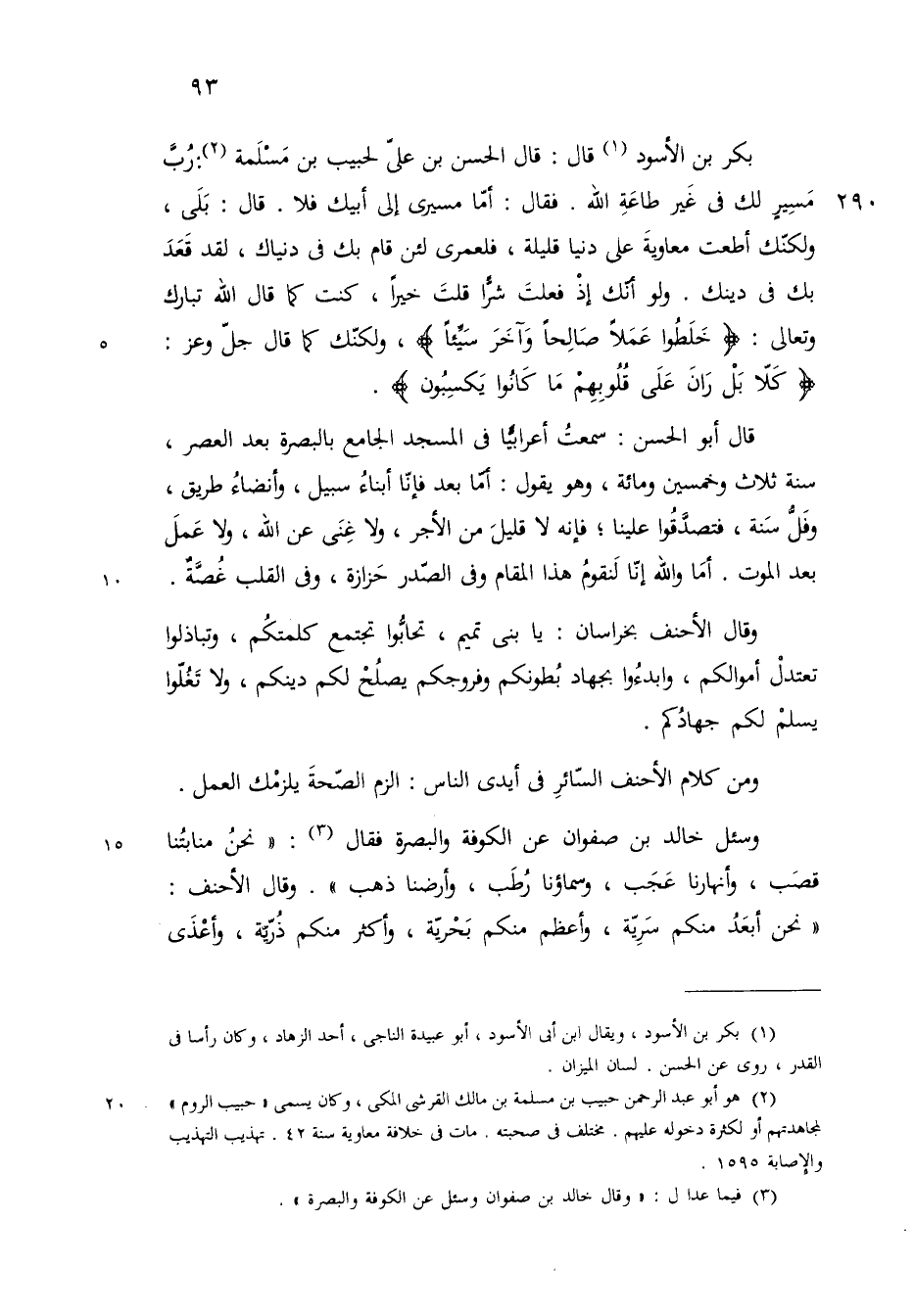 قال بكر بن الاسود قال الحسن بن علي لحبيب بن مسلمة رب مسير لك في غير طاعة الله قال أما مسيري الى أبيك فلا قال بلى ولكنك اطعت معاوية على دنيا قليلة فلعمري لئن كان قام بك في دنياك لقد قعد بك في دينك ولو انك ان فعلت شرا قلت خيرا كنت كما قال الله تعالى ( خلطوا عملا صالحا واخر سيئا ) ولكنك كما قال الله تعالى ( كلا بل ران على قلوبهم ما كانوا يكسبون )