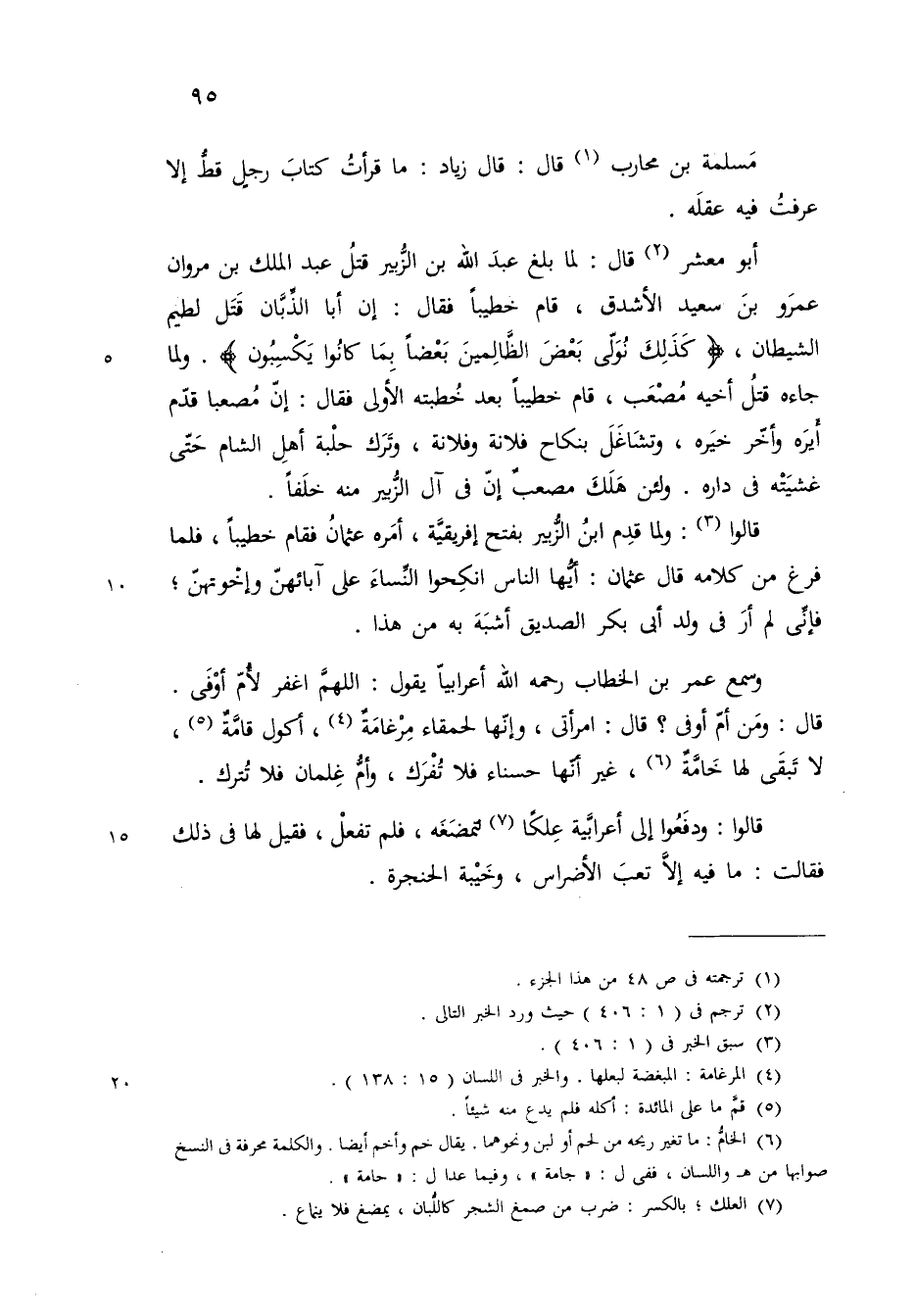 وقال ابو معشر لما بلغ عبد الله بن الزبير قتل عبد الملك بن مروان عمرو ابن سعيد الاشدق قام خطيبا فقال ان أبا ذبان قتل لطيم الشيطان ( كذلك نولى بعض الظالمين بعضا بما كانوا يكسبون ) ولما جاءه قتل أخيه مصعب بن الزبير قام خطيبا بعد خطبته الأولى فقال ان مصعبا قدم أيره وأخر خيره وتشاغل بنكاح فلانه وفلانه وترك حلبة اهل الشام حتى غشيته في داره