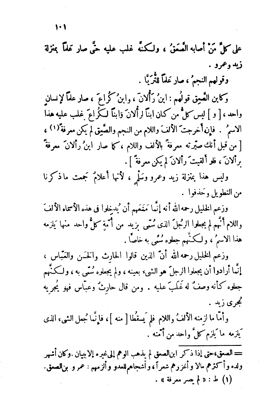 وزعم الخليل رحمه الله أن الذين قالوا الحارث والحَسَن والعباس، إنما أرادوا أن يجعلوا الرجل هو الشيء بعينه، ولم يجعلوه سُمّي به، ولكنهم جعلوه كأنه وصفٌ له غلَب عليه. ومن قال حارثٌ وعباس فهو يُجريه مُجرى زيد.