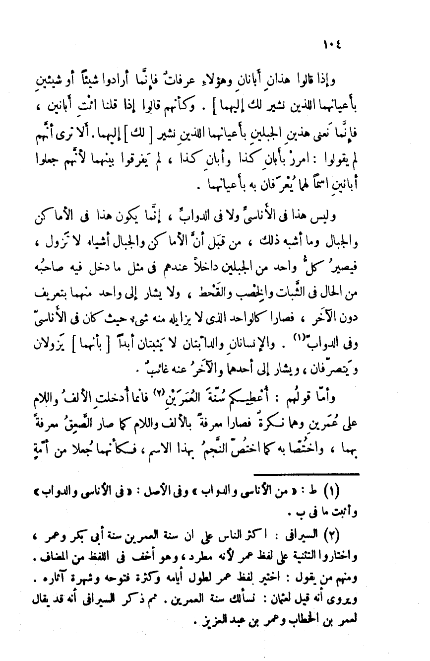 وليس هذا في الأناسى ولا في الدواب، إنما يكون هذا في الأماكن والجبال وما أشبه ذلك، من قبل أن الأماكن والجبال أشياء لا تزول، فيصير كل واحد من الجبلين داخلا عندهم في مثل ما دخل فيه صاحبُه من الحال في الثبات والخِصب والقحط، ولا يشار إلى واحد منهما بتعريف دون الآخر، فصارا كالواحد الذي لا يزايله منه شيء حيث كان في الأناسى وفي الدواب. والإنسانان والدابتان لا يثبتان أبدا بأنهما يزولان ويتصرفان، ويشار إلى أحدهما والآخر عنه غائب.