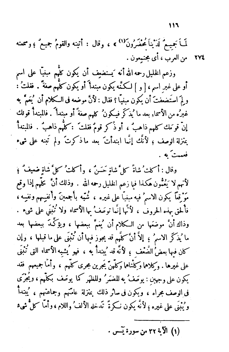 وزعم الخليل رحمه الله أنه يستضعف أن يكون كلهم مبنيا على اسم أو على غير اسم، ولكنه يكون مبتدأ أو يكون كلهم صفة. فقلت: ولمَ استضعفت أن يكون مبنيا؟ فقال: لأن موضعه في الكلام أن يُعمّ به غيره من الأسماء بعدما يُذكر فيكون كلهم صفة أو مبادأ. فالمبتدأ قولك إن قومك كلهم ذاهبٌ، أو ذكر قوم فقلت: كلهم ذاهبٌ. فالمبتدأ بمنزلة الوصف؛ لأنك إنما ابتدأت بعدما ذكرت ولم تبنه على شيء فعممت به.