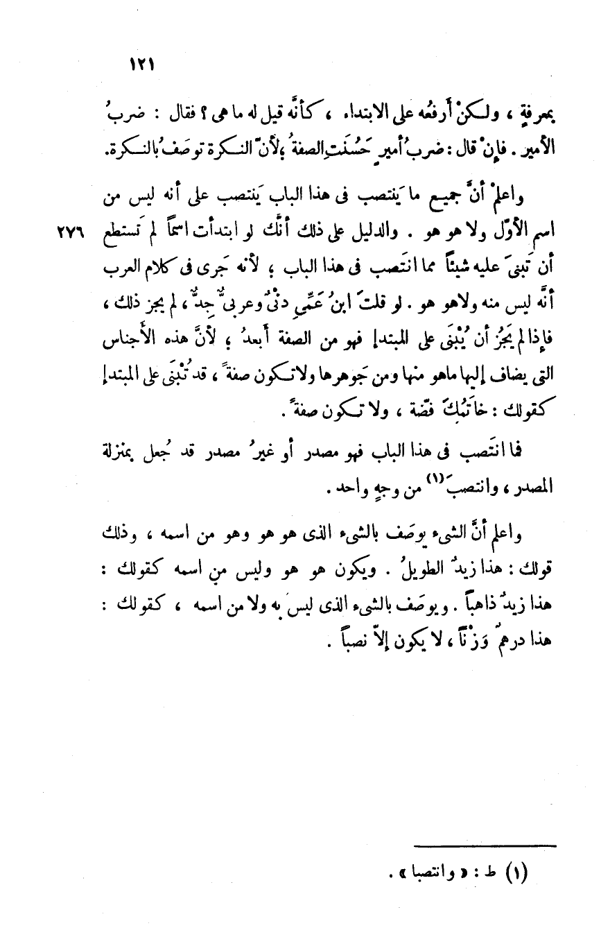 واعلم أن جميع ما ينتصب في هذا الباب ينتصب على انه ليس من اسم الأول ولا هو هو. والدليل على ذلك أنك لو ابتدأت اسما لم تستطع أن تبنى عليه شيئا مما انتصب في هذا الباب؛ لأنه جرى في كلام العرب أنه ليس منه ولا هو هو. لو قلتَ ابنُ عمي دنْيٌ وعربيٌ جِدٌ، لم يجز ذلك، فإذا لم يجز أن يُبنى على المبتدإ فهو من الصفة أبعد؛ لأن هذه الأجناس التي يضاف إليها ما هو منها ومن جوهرها ولا تكون صفة، وقد تُبنى على المبتدإ كقولك: خاتمك فضة، ولا تكون صفة.