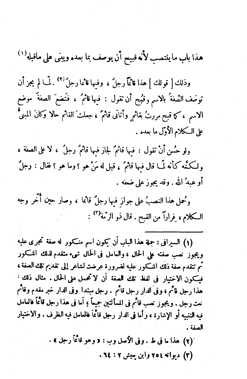 وحُمل هذا النصب على جواز فيها رجلٌ قائما، وصار حين أخر وجه الكلام، فرارا من القبح. قال ذون الرمة: