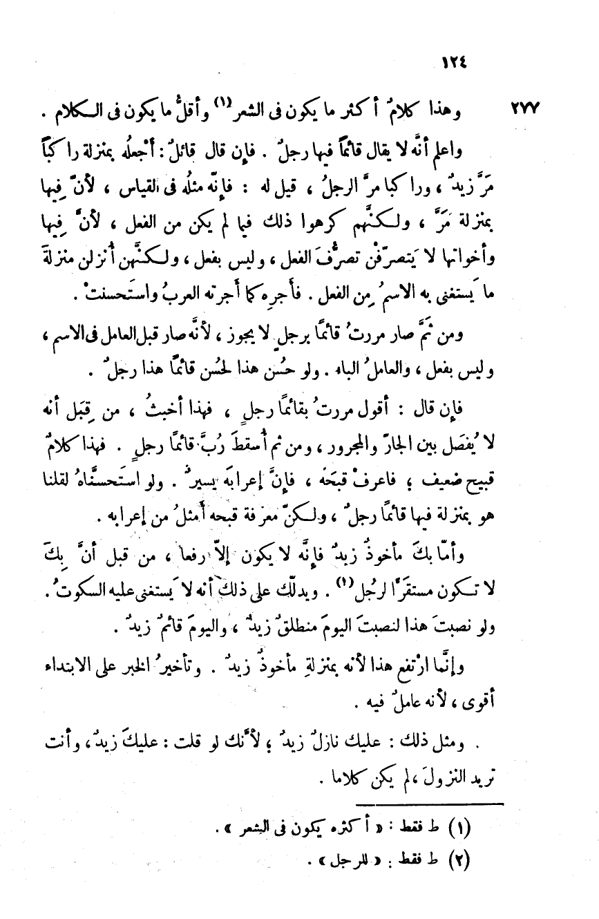 فإن قال: أقول مررت بقائما رجل، فهذا أخبث، من قبل أنه لا يُفصل بين الجار والمجرور، ومن ثم أُسقط رُبّ قائما رجلٍ. فهذا كلام قبيح ضعيف؛ فاعرفْ قبحه، فإن إعرابه يسير. ولو استحسناه لقلنا هو بمنزلة فيها قائما رجل، ولكن معرفة قبحه أمثل من إعرابه.