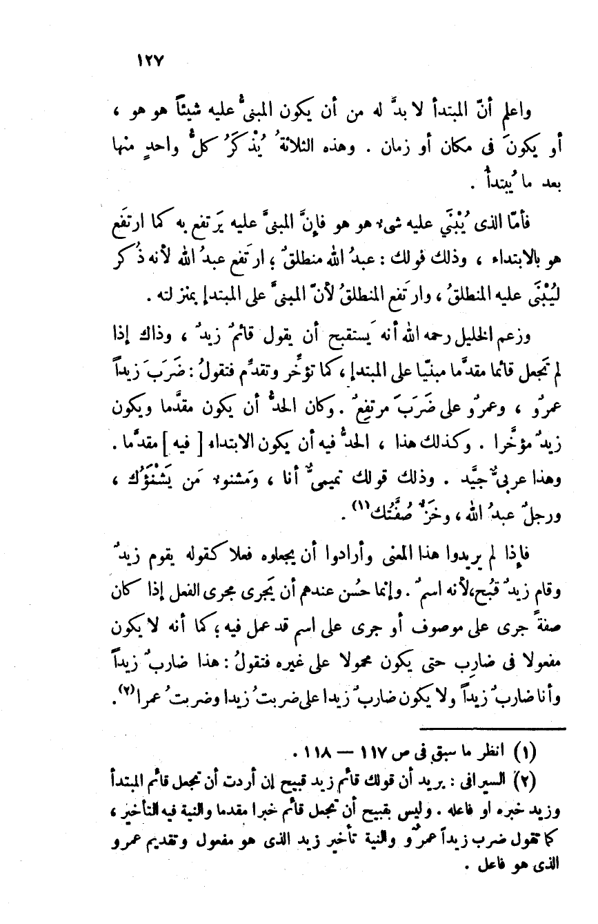 وزعم الخليل رحمه الله أنه يستقبح أن يقول قائم زيد، وذاك إذا لم تجعل قائما مقدَّماً مبنيا على المبتدإ، كما تؤخر وتقدم فتقول: ضرب زيدا عمرٌو، وعمرٌو على ضرب مرتفع. وكان الحد أن يكون مقدَّماً ويكون زيد مؤخرا. وكذلك هذا، الحد فيه أن يكون الابتداء فيه مقدَّماً. وهذا عربي جيد. وذلك قولك تميميٌّ أنا، ومَشنوءٌ مَن يشنَؤك، ورجلٌ عبدُ الله، وخزٌّ صُفّتك.