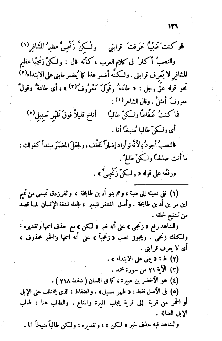 والنصب أكثر في كلام العرب، كأنه قال: ولكن زنجيا عظيمَ المشافر لا يعرف قرابتي. ولكنه أضمر هذا كما يُضمر ما بنى على الابتداء نحو قوله عز وجل: " طاعةٌ وقولٌ معروفٌ "، أي طاعةٌ وقولٌ معروفٌ أمثل. وقال الشاعر: