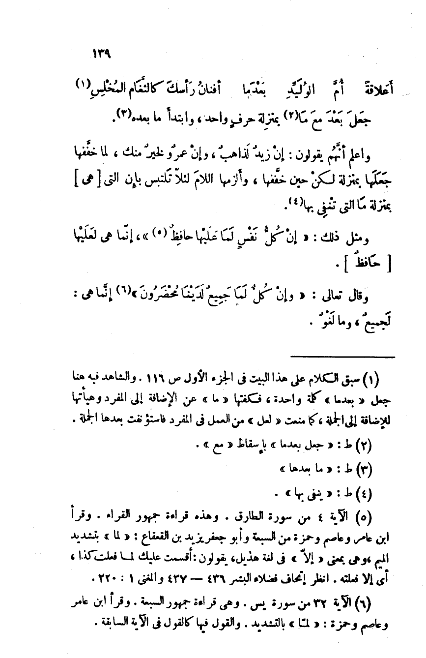ومثل ذلك: " إن كلُّ نفسٍ لما عليها حافظٌ "، إنما هي لَعلَيهْا حافظٌ.