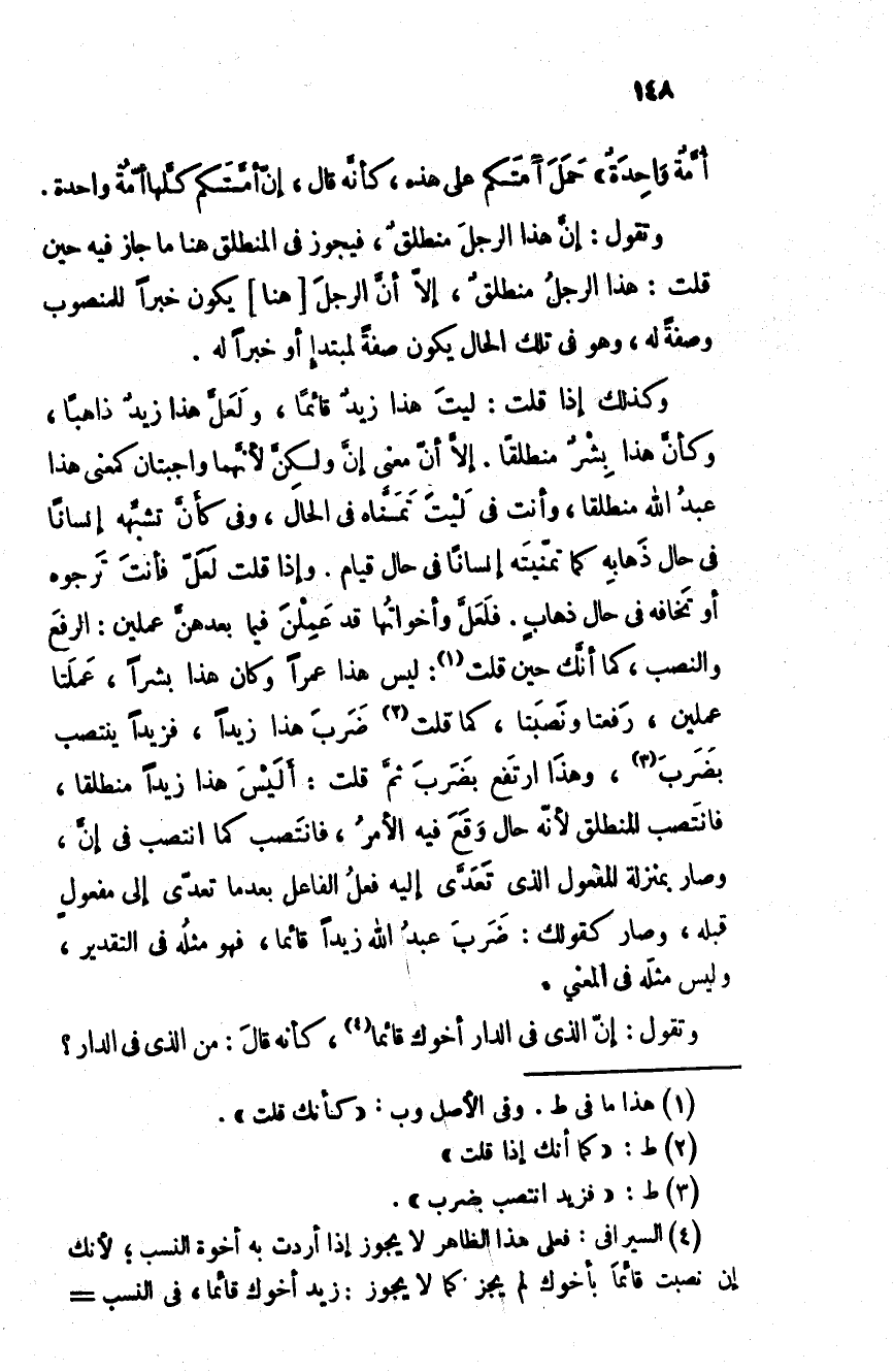 وتقول: إن هذا الرجل منطلقٌ، فيجوز في المنطلق هنا ما جاز فيه حين قلت: هذا الرجل منطلقٌ، إلا أن الرجل هنا يكون خبرا للمنصوب وصفة له، وهو في تلك الحال يكون صفة لمبتدأ أو خبرا له.