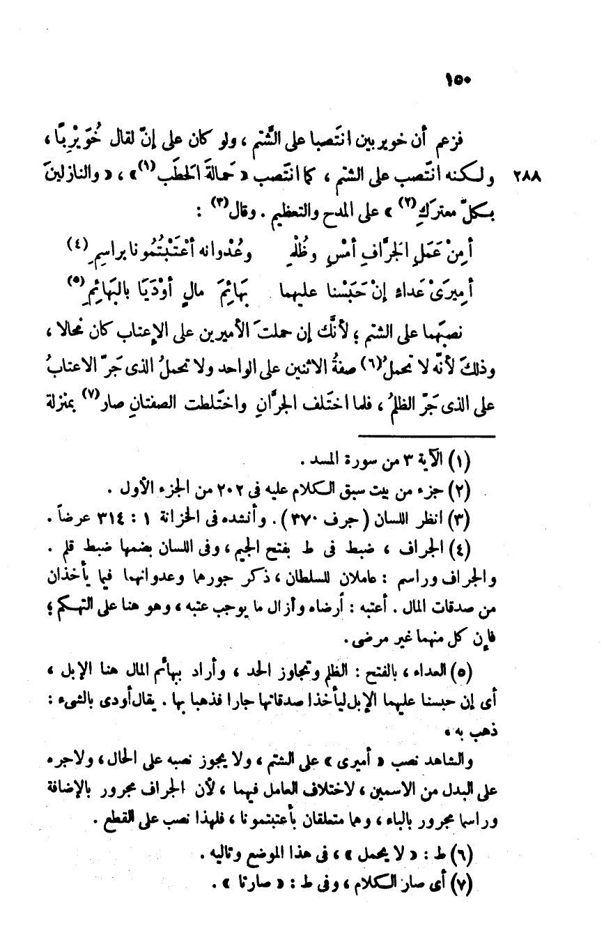 فزعم أن خويربين انتصبا على الشتم، ولو كان على إن لقال خُويرباً، ولكنه انتصب على الشتم، كما انتصب " حمالةَ الحطب " - " والنازلينَ بكلّ معترَكِ " على المدح والتعظيم. وقال: