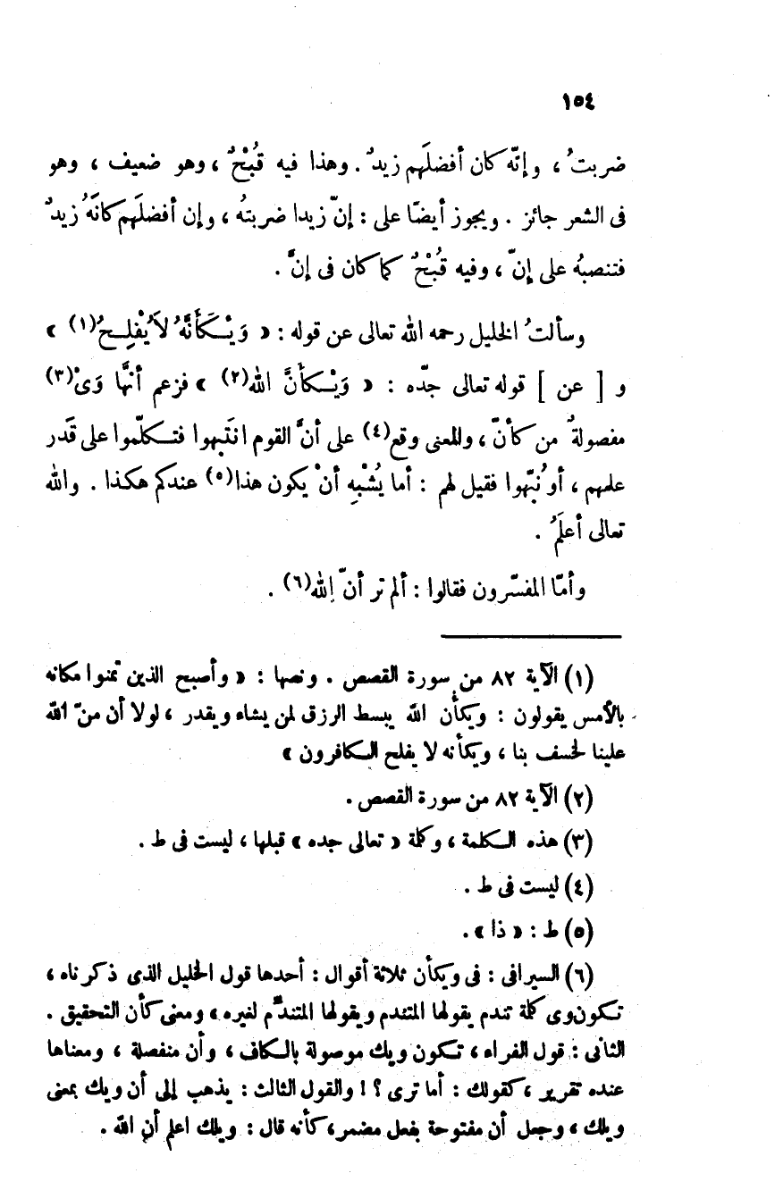 وسألت الخليل رحمه الله تعالى عن قوله: " ويْكأنّه لا يُفلح " وعن قوله تعالى جدّه: " ويْكأن الله " فزعم أنه ويْ مفصولةٌ من كأن، والمعنى وقع على أن القوم انتبهوا فتكلموا على قدر علمهم، أو نُبّهوا فقيل لهم: أما يشبه أن يكون هذا عندكم هكذا. والله تعالى أعلم.