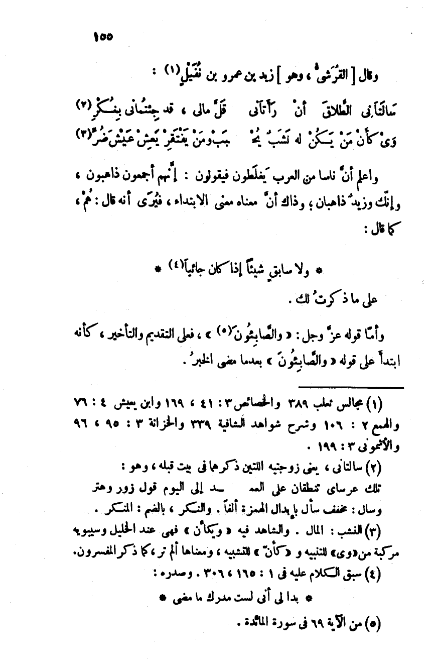 وَيْ كأنْ مَن يَكُنْ له نشبٌ يُح - بَبْ ومَن يَفْتَقِرْ يعِشْ عَيْشَ ضُرِّ واعلم أن ناسا من العرب يغلطون فيقولون: إنهم أجمعون ذاهبون، وإنك وزيد ذاهبان؛ وذاك أن معناه معنى الابتداء، فيُرى أنه قال: هم، كما قال: ولا سابقٍ شيئاً إذا كان جائياَ على ما ذكرتُ لك.