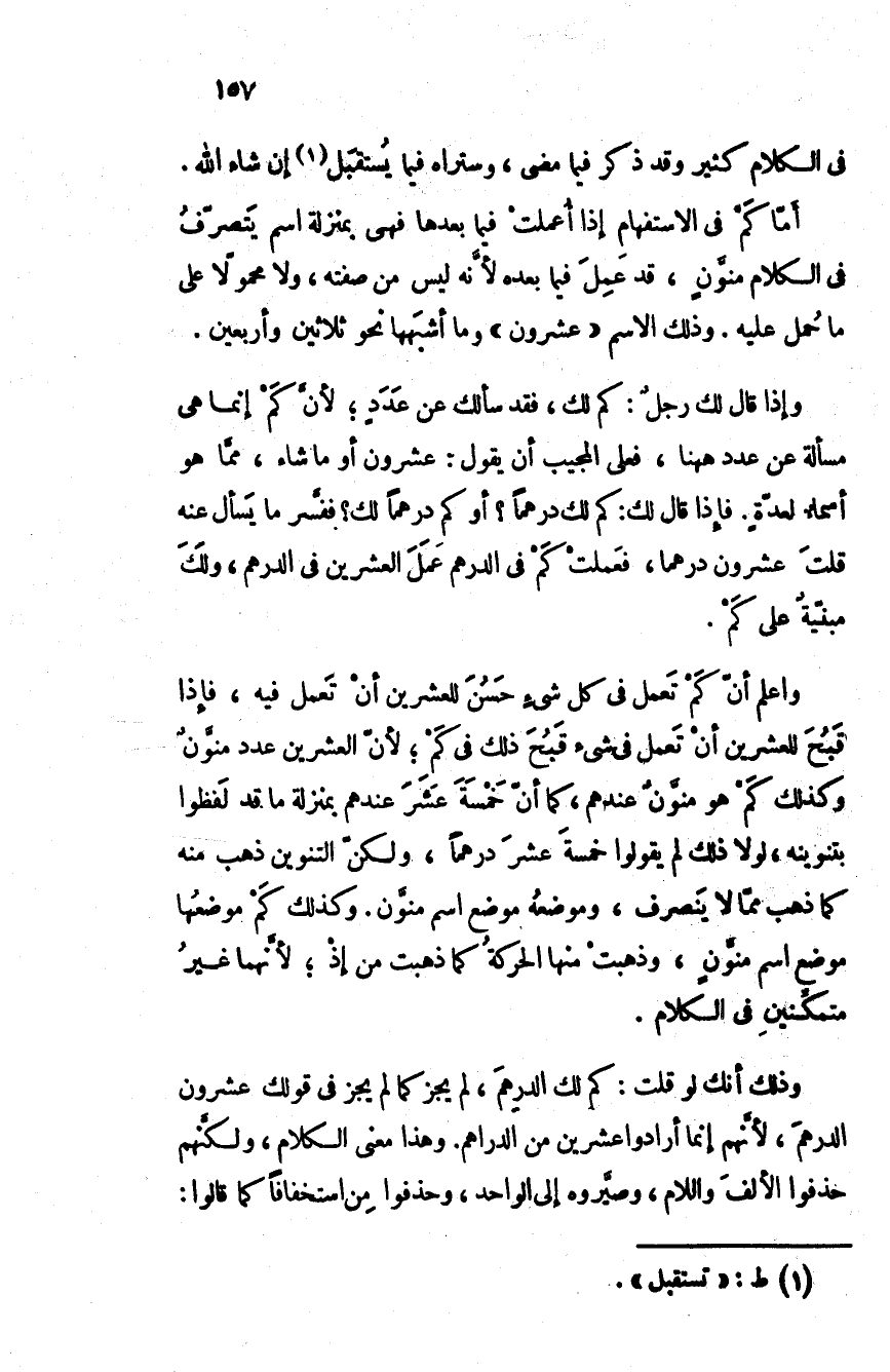 أما كم في الاستفهام إذا أُعملت فيما بعدها فهي بمنزلة اسم يتصرف في الكلام منون، قد عمل فيما بعده لأنه ليس من صفته، ولا محمولا على ما حُمل عليه. وذلك الاسم عشرون وما أشبهها نحو ثلاثين وأربعين.