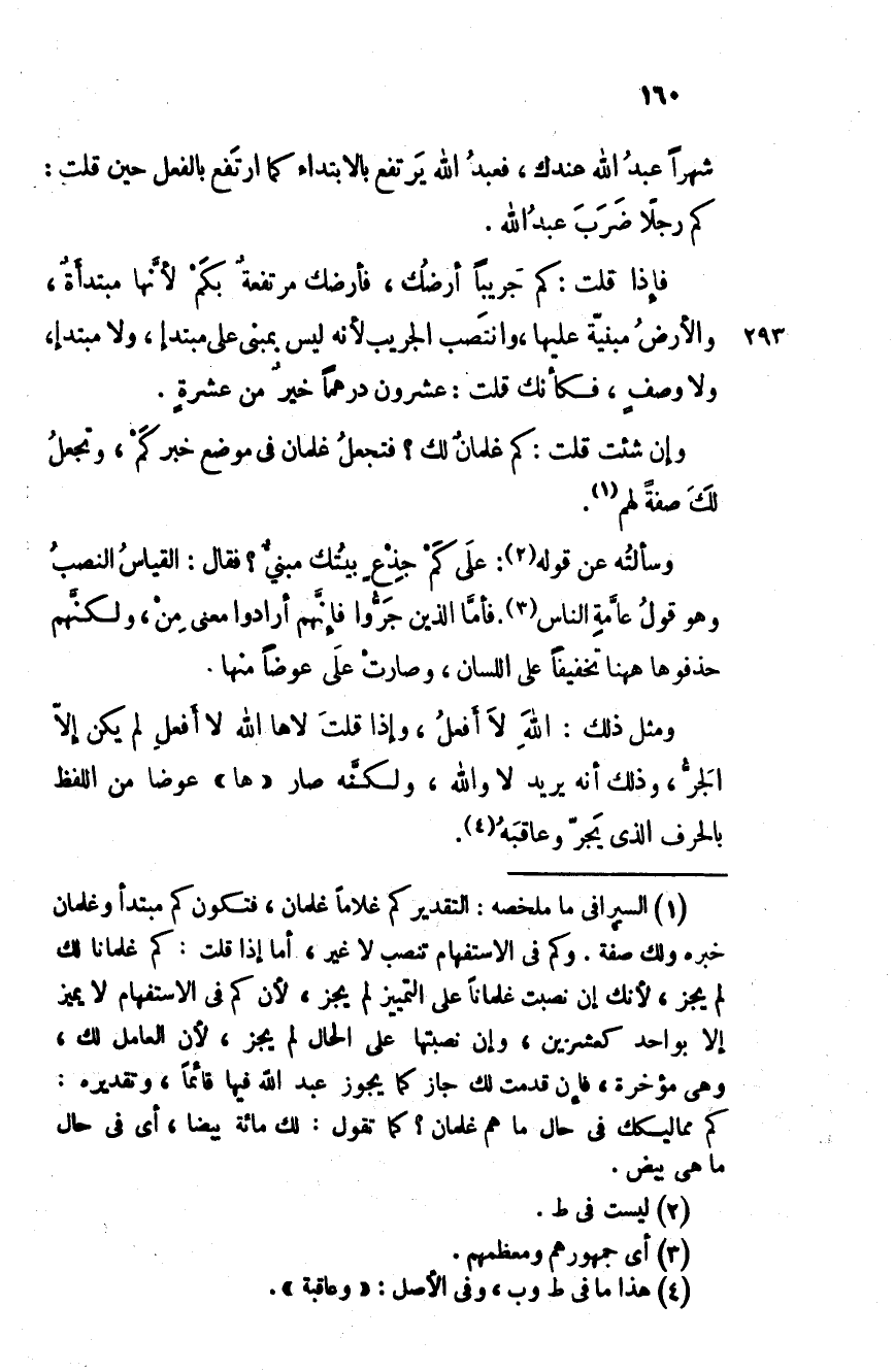 وسألته عن قوله: على كم جذعٍ بيتُك مبني؟ فقال: القياس النصب وهو قول عامة الناس. فأما الذين جروا فإنهم أرادوا معنى مِن، ولكنهم حذفوها ههنا تخفيفا على اللسان، وصارت على عوضا منها.