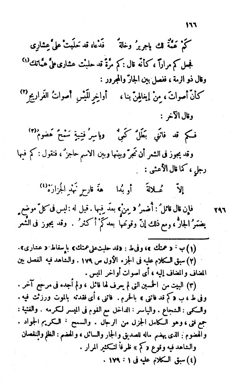 فجعل كم مرارا، كأنه قال: كم مرة قد حلبت عشارى على عماتك. وقال ذو الرمة، ففصل بين الجار والمجرور: