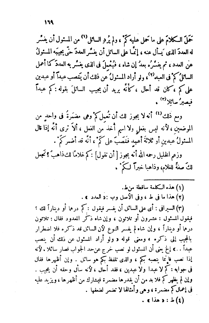 حمل الكلام على ما حمل عليه كم، ولم يُرد السائل من المسئول أن يفسر له العدد الذي يسأل عنه، إنما على السائل أن يفسر العدد حتى يجيبه المسئول عن العدد، ثم يفسره بعد إن شاء، فيعمل في الذي يفسر به العدد كما أعمل السائل كم في العبد، ولو أراد المسئول عن ذلك أن ينصب عبدا أو عبدين على كم، كان قد أحال، كأنه يريد أن يجيب السائل بقوله: كم عبدا فيصير سائلا.
