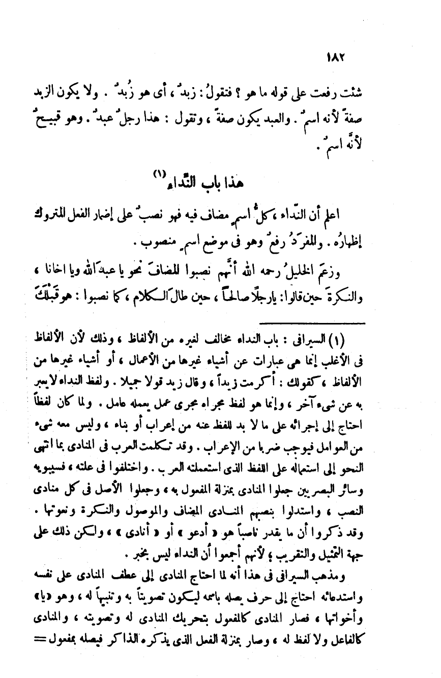 اعلم أن النداء، كل اسم مضاف فيه فهو نصبٌ على إضمار الفعل المتروك إظهارُه. والمفرد رفعٌ وهو في موضع اسمٍ منصوب.