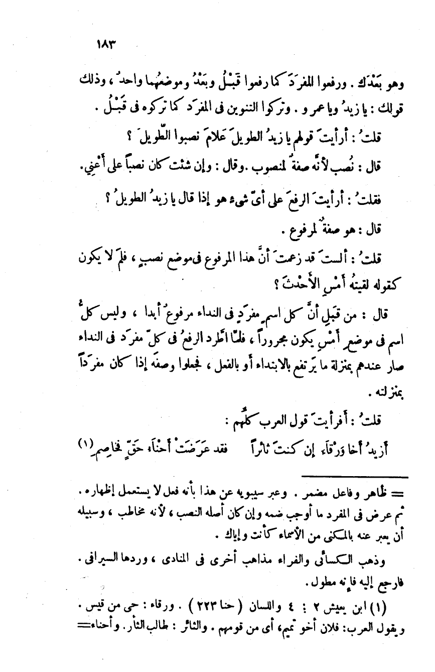 قلت: ألستَ قد زعمت أن هذا المرفوع في موضع نصبٍ، فلمَ لا يكون كقوله لقيتُه أمس الأحدثَ؟ قال: من قبل أن كل اسم مفرد في النداء مرفوع أبدا، وليس كل اسم في موضع أمس يكون مجرورا، فلما اطرد الرفعُ في كل مفرد في النداء صار عندهم بمنزلة ما يرتفع بالابتداء أو بالفعل، فجعلوا وصفَه إذا كان مفردا بمنزلته.