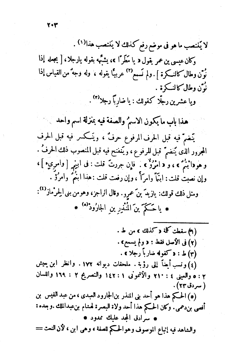 ومثل ذلك قولك: يا زيدَ بنَ عمرو. وقال الراجز، وهو من بنى الحِرماز: يا حكمَ بنَ المنذرِ بنِ الجارودْ