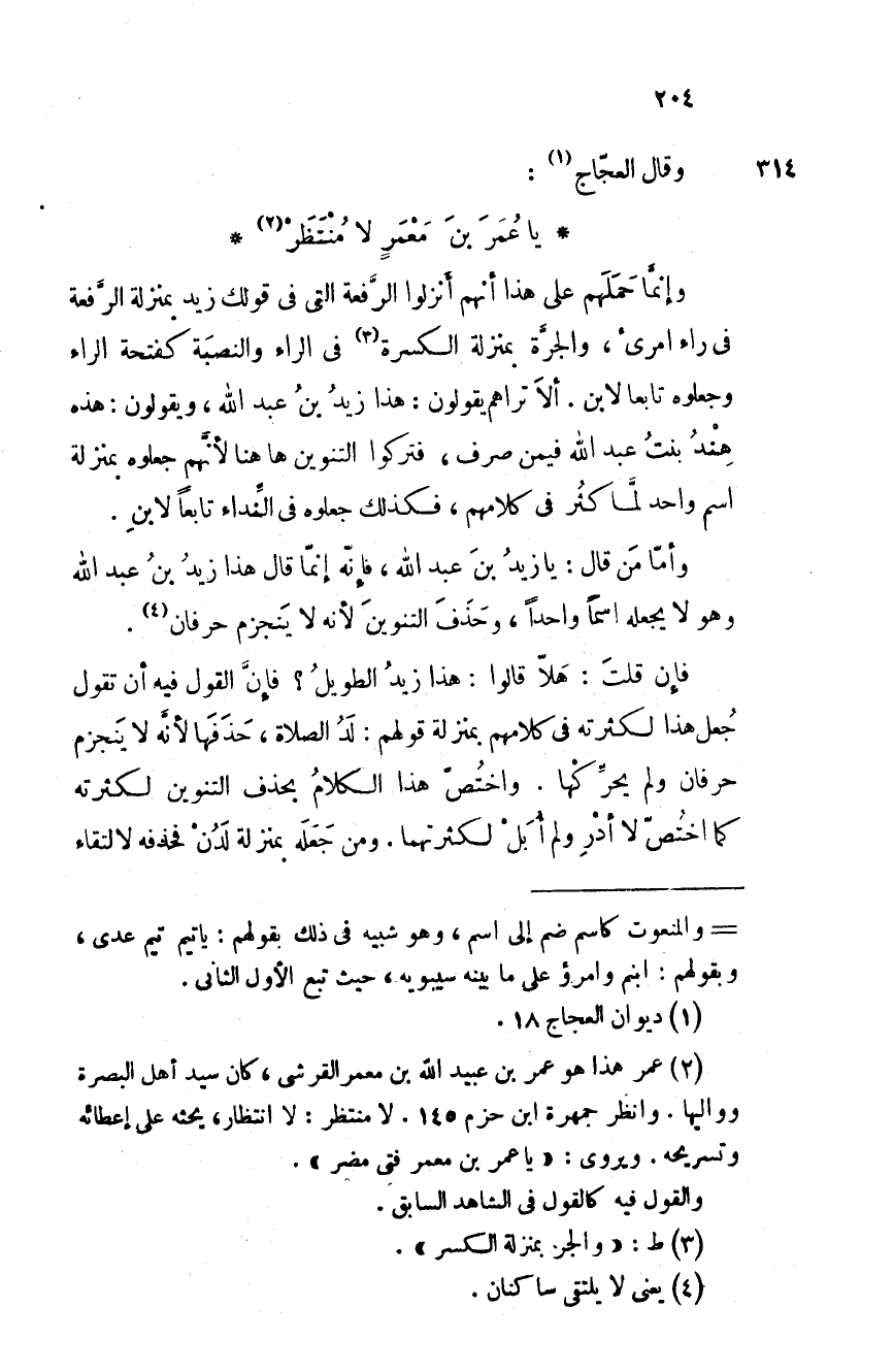 وقال العجاج: يا عمرَ بنَ معمرٍ لا منتَظَرْ وإنما حملهم على هذا أنهم أنزلوا الرفعة التي في قولك زيد بمنزلة الرفعة في راء امرئ، والجرة بمنزلة الكسرة في الراء والنصبة كفتحة الراء وجعلوه تابعا لابن. ألا تراهم يقولون: هذا زيدُ بنُ عبد الله، ويقولون: هذه هندُ بنتُ عبد الله فيمن صرف، فتركوا التنوين ها هنا لأنهم جعلوه بمنزلة اسم واحد لما كثُر في كالمهم، فكذلك جعلوه في النداء تابعا لابن.