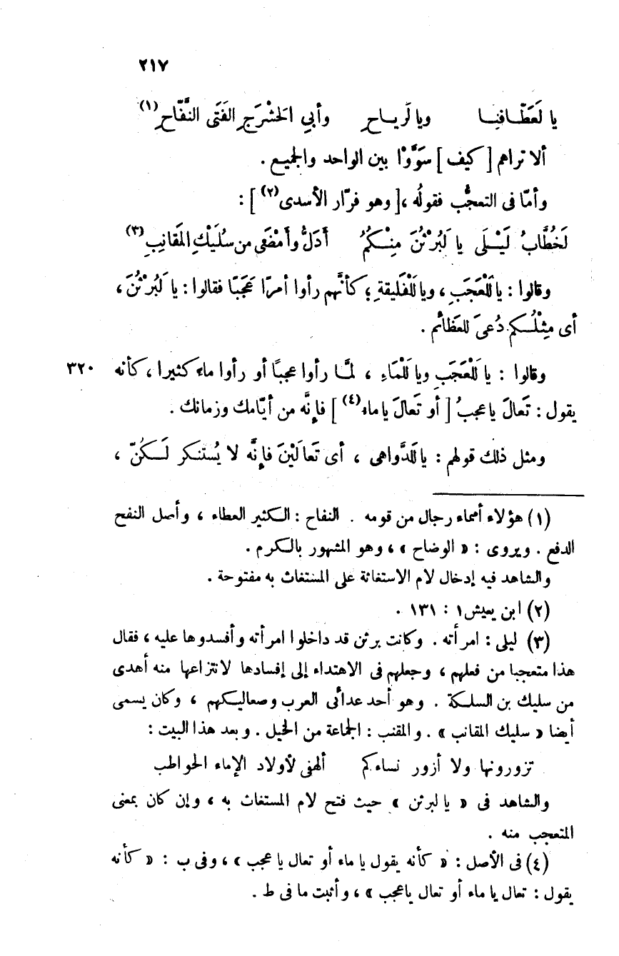 وأما في التعجّب فقوله، وهو فرار الأسدى: لَخُطّابُ لَيلى يا لَبُرثنَ منكمُ أدلُّ وأمضى من سُليك المقانبِ وقالوا: يا لَلعجب، ويا لَلفليقة؛ كأنهم راوا أمرا عجبا فقالوا: يا لَبُرثن، أي مثلكم دُعي للعظائم.